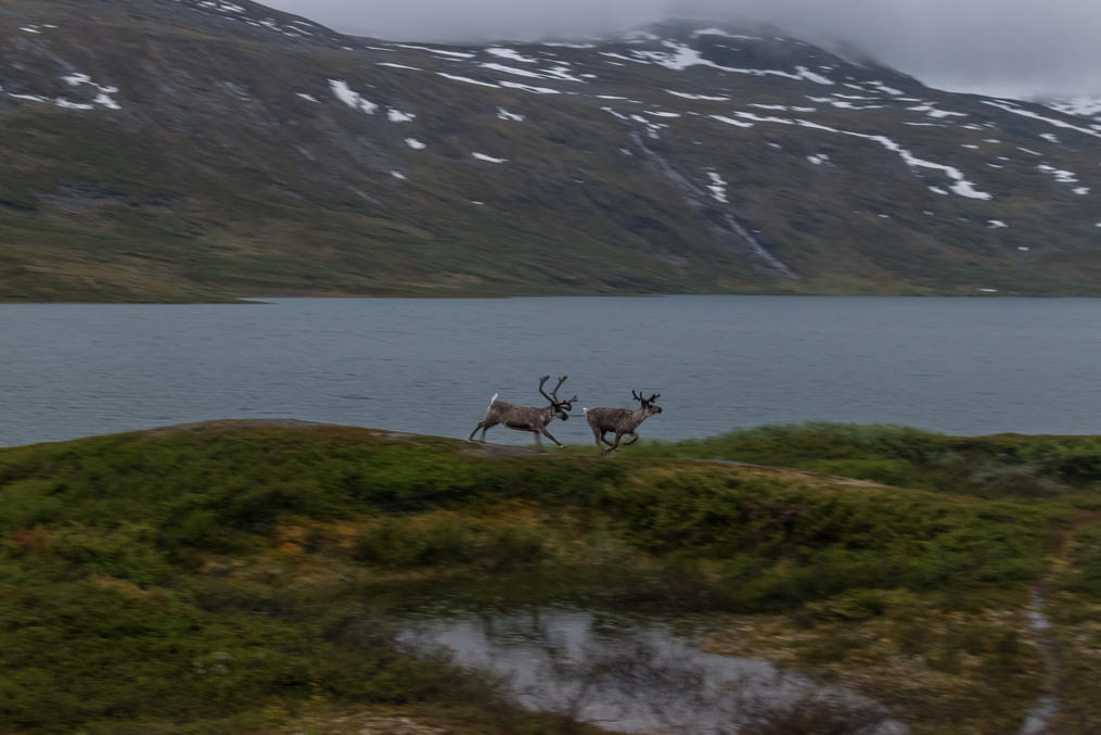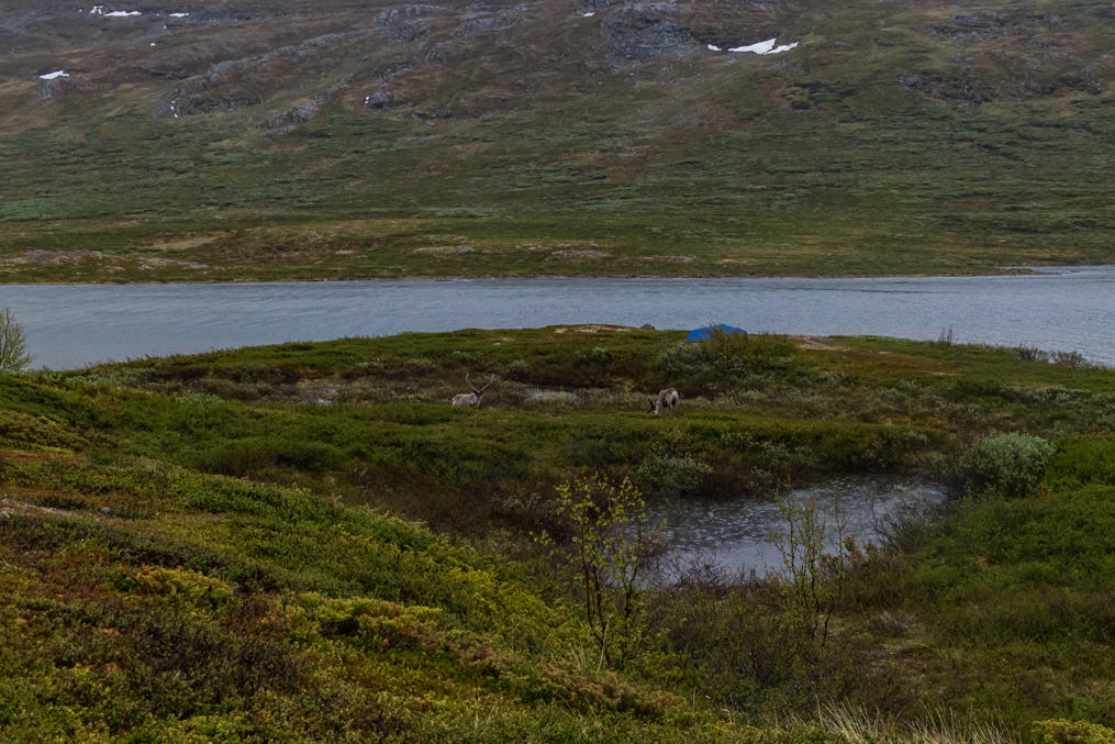 36. Я обожаю оленей, и тут на севере их обычно встретить очень легко, даже просто на машине, но в этом походе оленей мне, увы, попалось очень мало. Возможно, в это время года их стада находятся выше в горах. Эта парочка — единственные, встретившиеся мне в этот день. Завидев меня, конечно, они взяли копытца в руки.