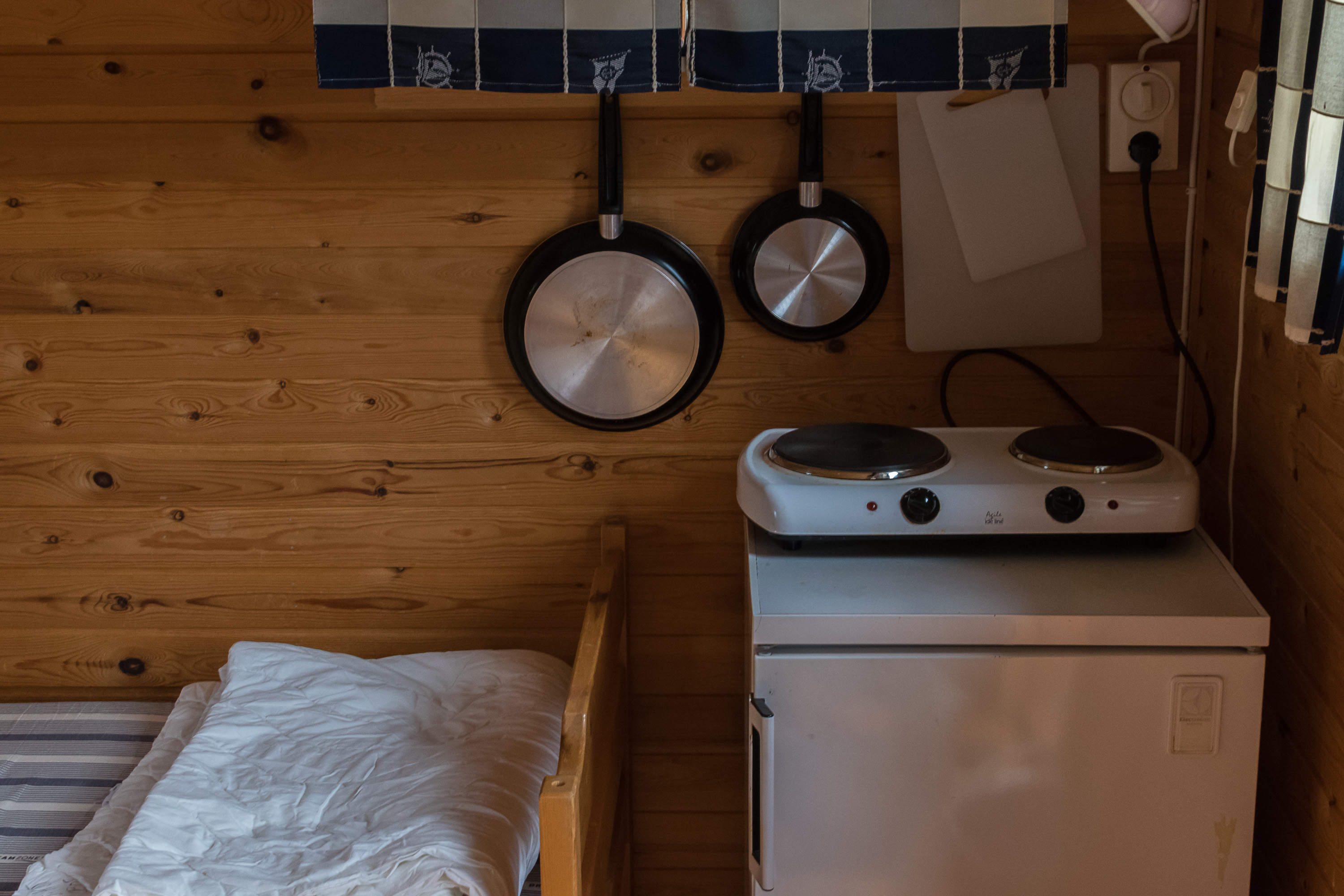 2. Домик был довольно спартанским, две кровати, стол да кое-какие кухонные принадлежности. Я не очень внимательно бронировал его, и для меня стало сюрпризом, что он без собственного туалета и душа. Хотя, конечно, это нормально для кемпингов, да и за те деньги было ожидаемо, что домик будет именно такой. Хуже было то, что у меня не было интернета! Моя финская SIM-карта от DNA, которая там работает как часы, здесь упорно не хотела пускать меня в интернет в роуминге (хотя по условиям тарифа должна), на прошлогодней шведской SIM-карте от Telia, конечно, денег уже не было, и Wi-Fi в кемпинге тоже не было. Ну, у главных строений вроде какой-то был. Я долго настойчиво вглядывался в окна запертого кафе, надеясь, что пароль у них где-нибудь написан, и потом даже сумел поймать кого-то из работников, и они мне дали пароль, но он не подошел. В конце концов пришлось смириться с тем, что в интернете на ночь посидеть не выйдет. По крайней мере, я взял с собой почитать кое-что.