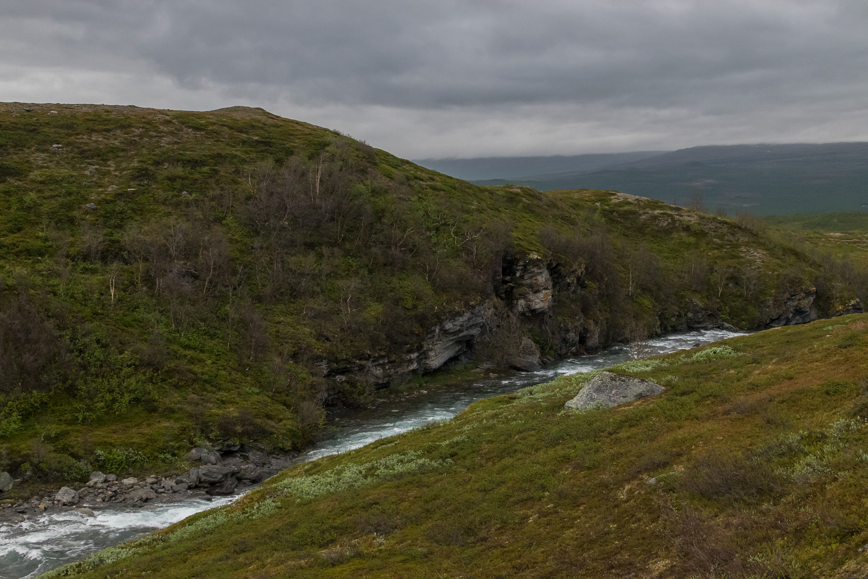 9. Долина Абескоэатну в основном покрыта лесами горной березы. Они по-своему красивы, но в них всегда хочется уже поскорее забраться выше, в открытую тундру. Очень приятно увидело сразу же полное отсутствие комаров! С ним на севере обычно все очень плохо, и я ожидал этого (и запасся средством и шапкой от комаров), но, похоже, их сезон все еще не начался.