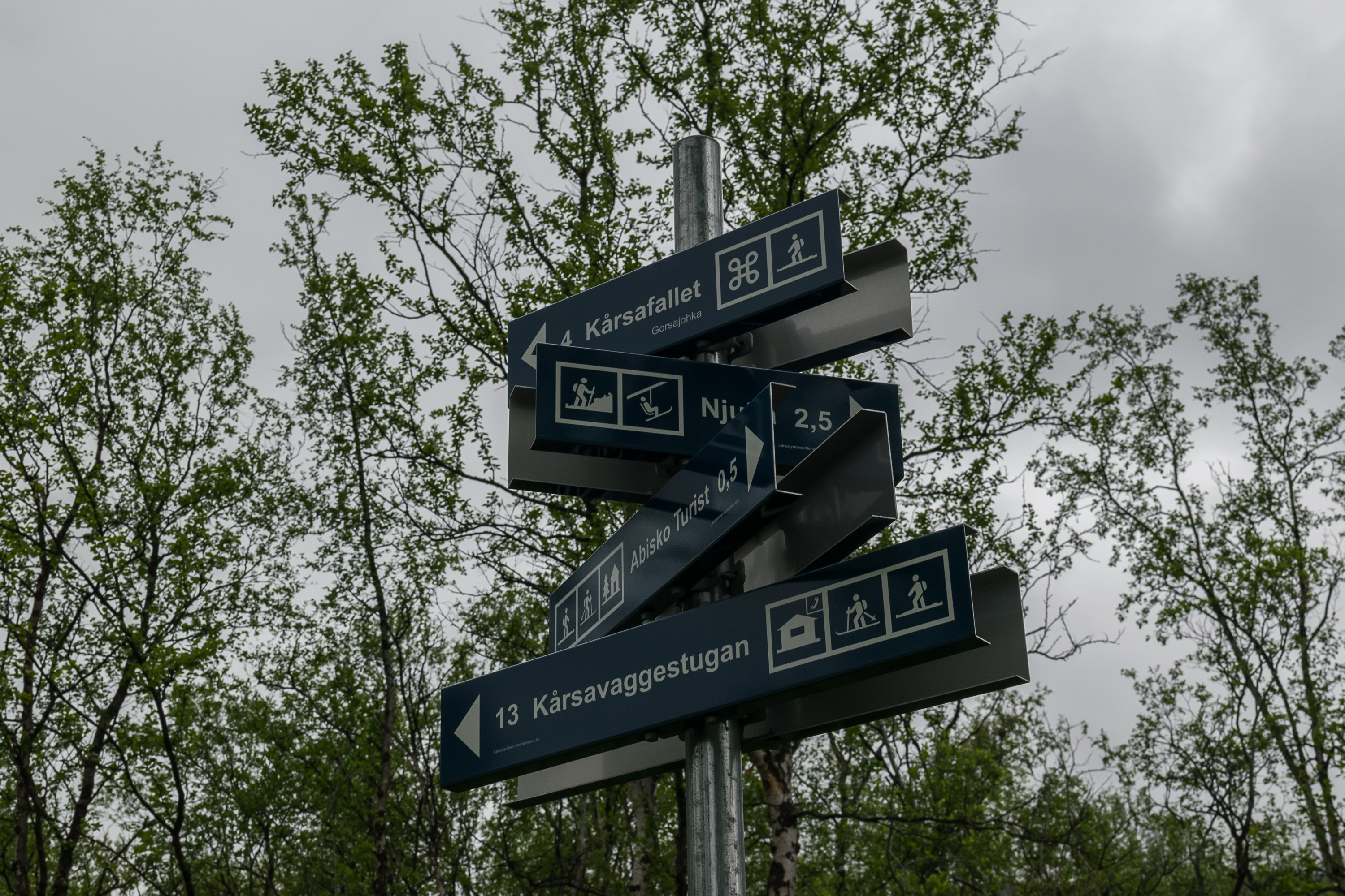 Но в этот раз я начал поход не с официального начала Кунгследена, отмеченного небольшой аркой, а с другого берега реки Абескоэатну. Конечной точкой этого дня был приют Корсавагге (Kårsavagge). Я, правда, намеревался идти туда не прямой тропой, а через водопад Корсафаллет, также отмеченный на этом указателе, так что общее расстояние выходило 15 км или несколько больше. В визит-центр национального парка через дорогу от стоянки я не пытался заходить, он все равно уже закрыт должен был быть на ночь.