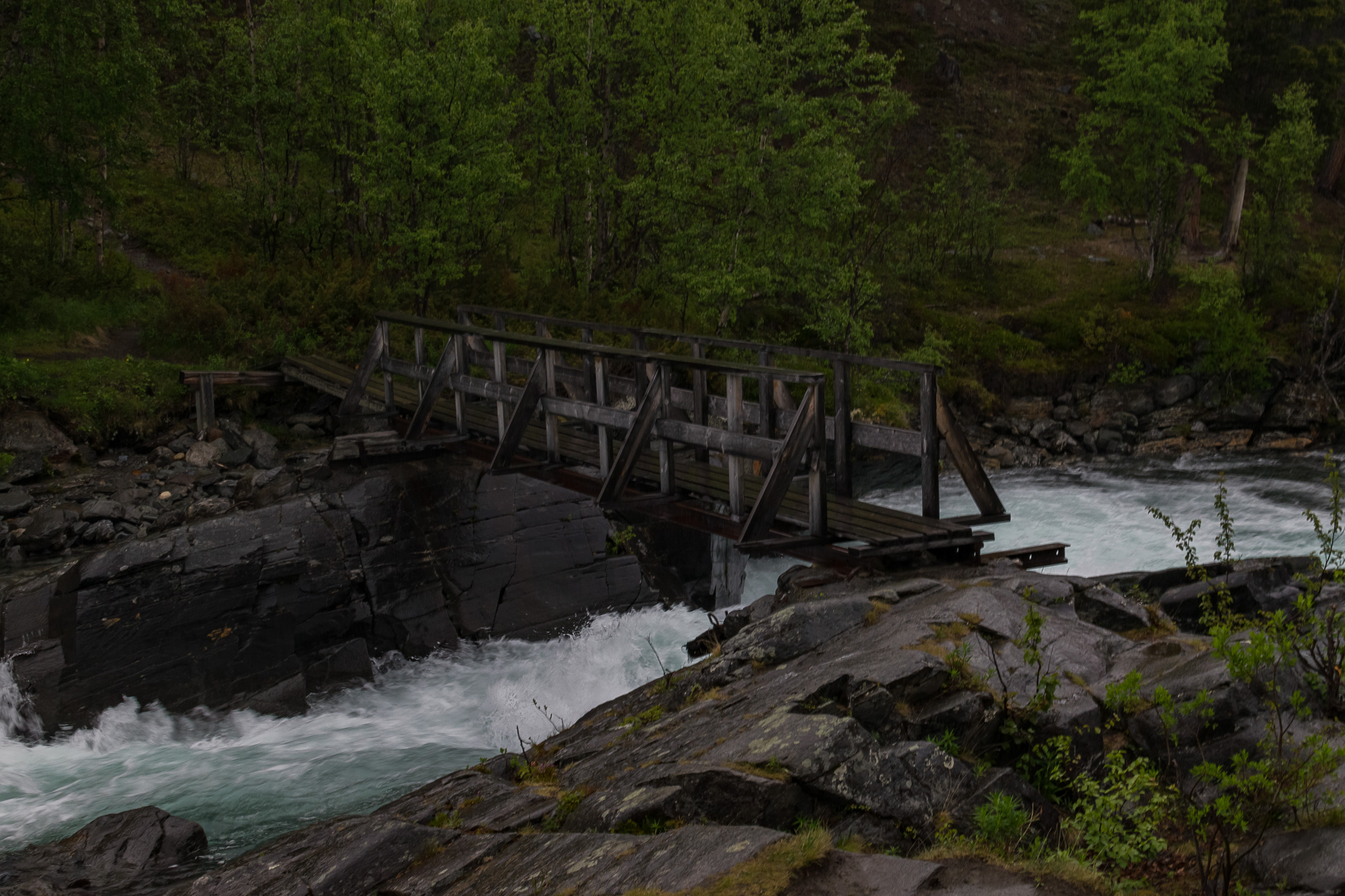 13. Официальные топографические карты не показывают тропу по южному берегу Горсайокки, и этот маленький мостик у Корсафаллета на первый взгляд ведет в никуда. Но этот поход я планировал, пользуясь замечательным путеводителем по этим местам издательства Calazo, который упоминал южный берег реки до следующего мостика как альтернативу прямой тропе в Корсавагге. Вариант выглядел интригующе, поэтому я его и выбрал. Эта тропа никак не отмечена, и на местности периодически попросту теряется, но сбиться с пути здесь невозможно — в любом случае ты идешь попросту берегом реки. И маршрут такой оказался очень интересным, потому что вслед за Корсафаллетом в ущелье реки можно увидеть целую цепочку водопадов, некоторые из них еще прекраснее! Собственно, само слово "горса" по-саамски вроде бы и изначает "ущелье".