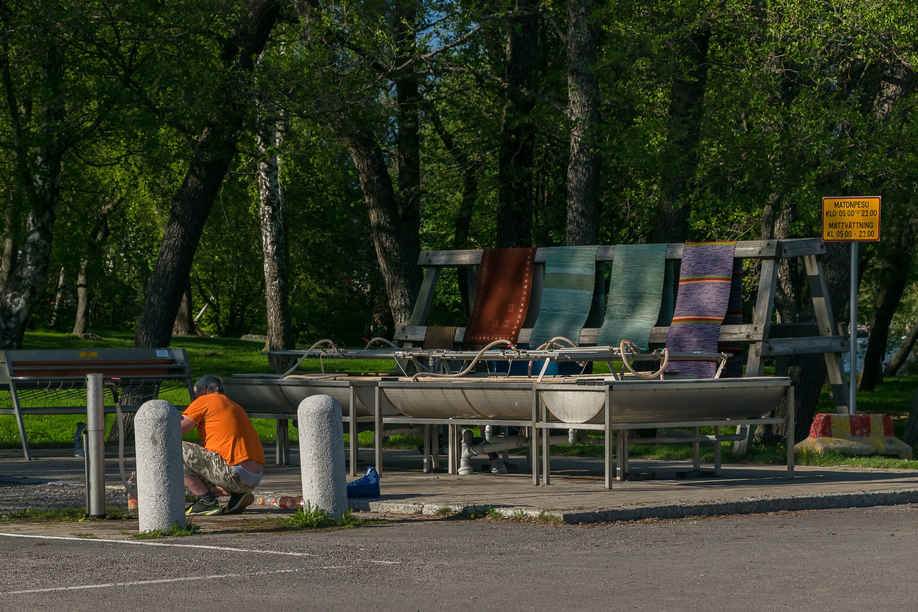 В Финляндии (по крайней мере, в некоторых городах) в теплое время года организуются общественные точки для стирки ковров. С большими корытами, водой из шланга и местами для сушки. Приходи да стирай сколько угодно. Зимой это все куда–то увозят.