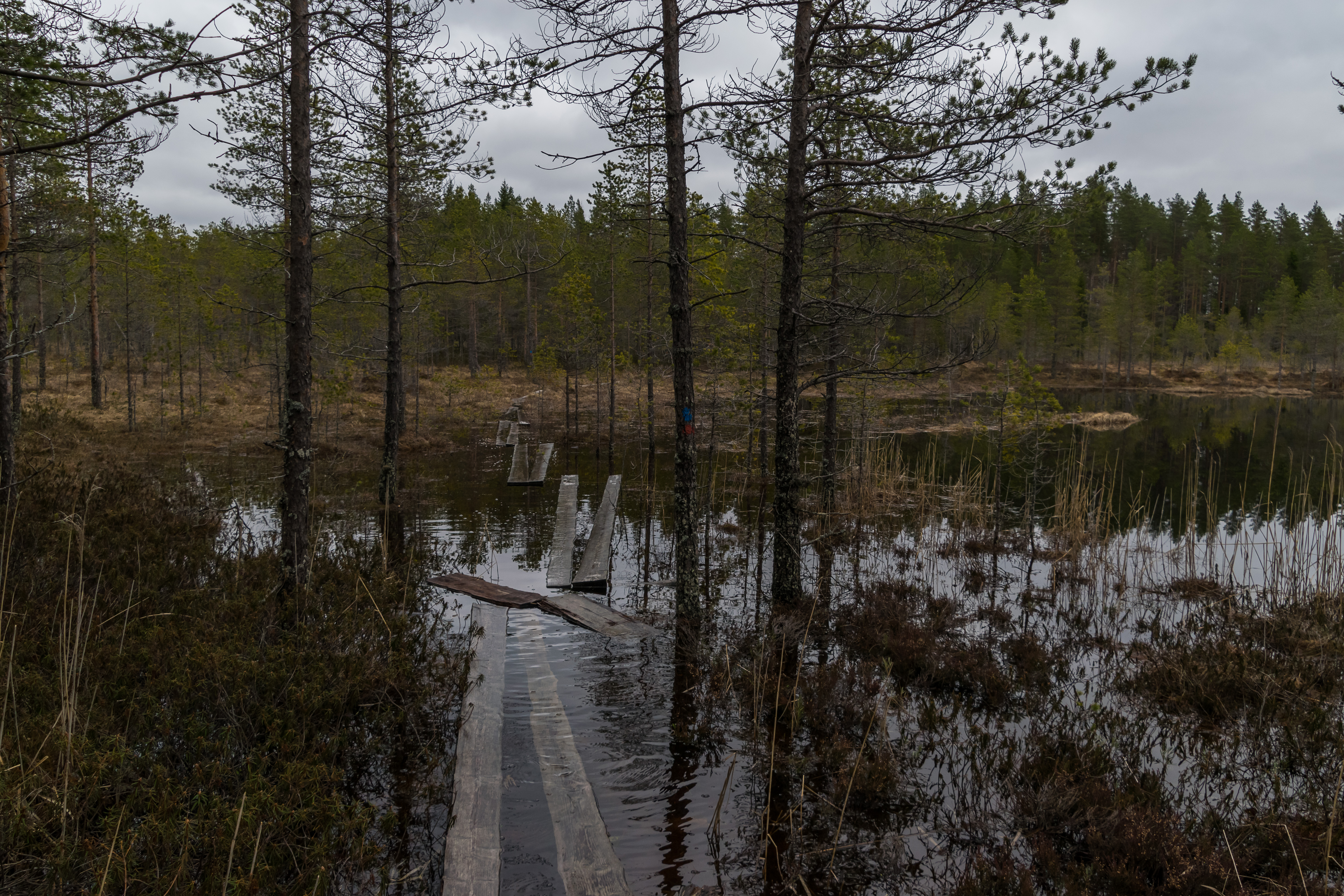 На сколько–нибудь популярных пеших тропах в Финляндии обычно прокладывают деревянные дорожки–гати на участках, проходящих по болотам и других сырым местам. Характерный вид финской гати, обычно делающейся из двух широких досок, знаком каждому, кто был в финских национальных парках. Иногда, однако, и гать не помогает пройти, не замочив ног. Фото сделано 5 мая у ручья Руухипуро в национальном парке Саламаярви в Центральной Финляндии.