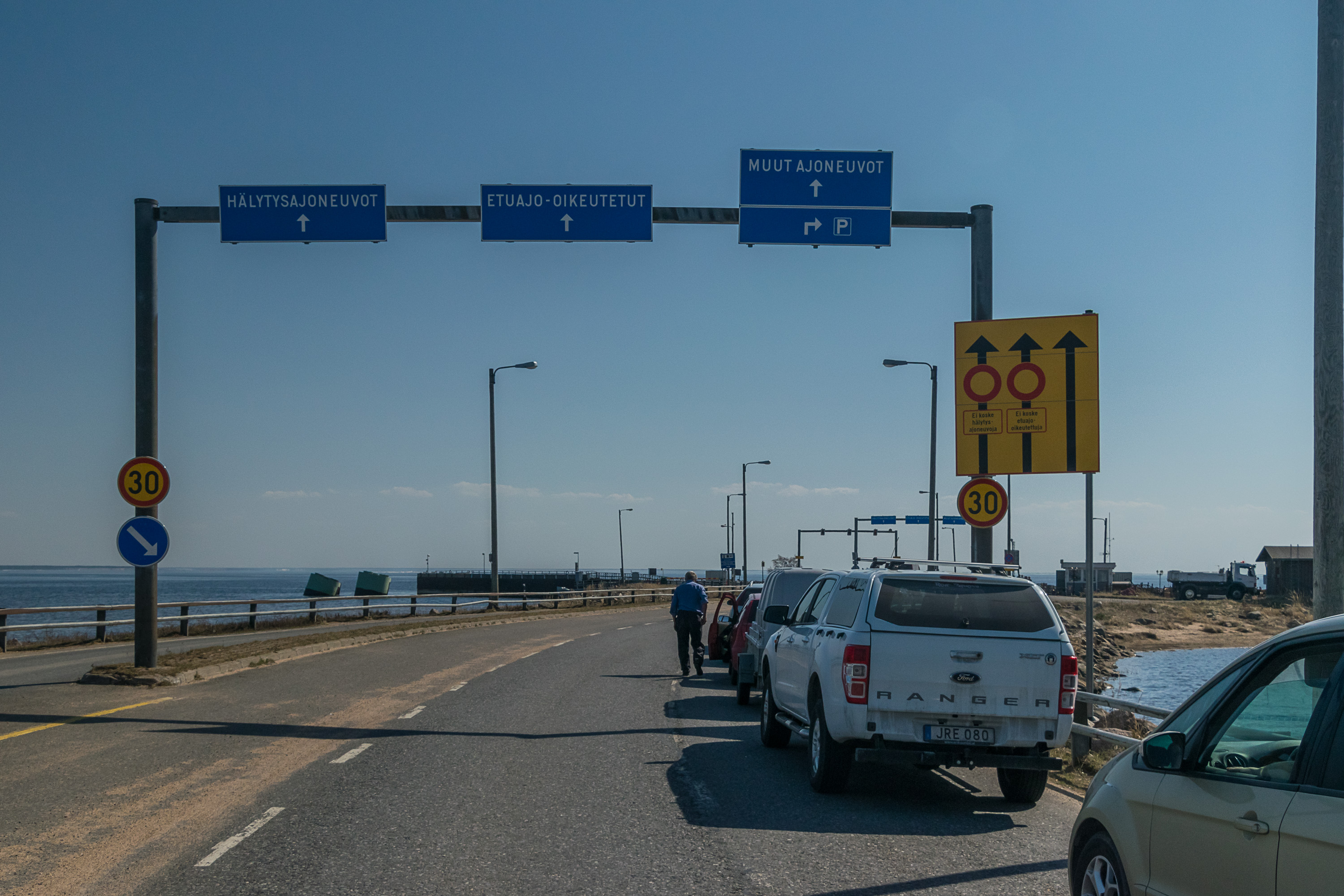 О.: Подъедьте к шлагбауму на пристани либо вставайте в очередь за ним; если есть несколько полос, не пользуйтесь полосами для автобусов ("linja–autot"), для экстренных служб ("hälitysajoneuvot") или для приоритетного проезда ("etuajo–oikeus"). Если написано "muut ajoneuvot" (прочие транспортные средства), вам скорее всего туда. В темное время суток выключите фары во время ожидания парома, чтобы не слепить его персонал. Ознакомьтесь с расписанием переправы, которое должно быть где–либо вывешено, либо найдите свою переправу на сайте FinFerries. Мелкие паромы обычно ходят по требованию. Если ваш паром на другом берегу, а вы первый в очереди, поищите кнопку вызова парома (обычно подписана по–английски "call ferry"). Заезжайте на паром, следуя сигналам светофора над полосами на пристани и/или пароме, при наличии таковых. Вам не требуется как–либо взаимодействовать с персоналом парома. Пользование переправами бесплатно. Во время движения парома можете как оставаться в машине, так и выйти, подышать воздухом и пофотографировать. На более крупных паромах есть туалет и сидячий салон. Выезжайте с парома, также следуя сигналам светофоров.