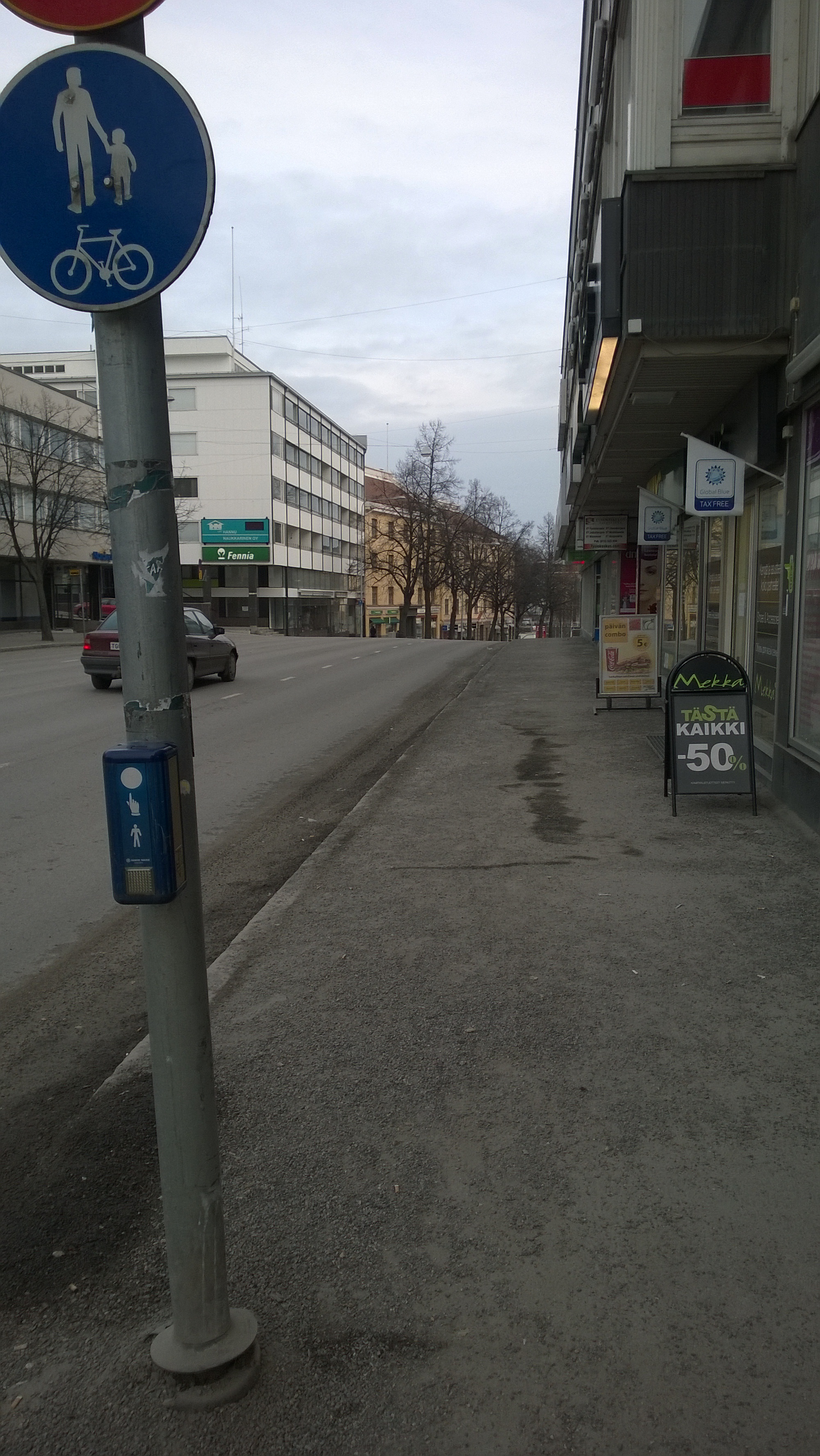 О.: Могут, если установлен знак велодорожки, совмещенной с тротуаром (как на фото выше). В реальности всем пофиг и на велосипедах ездят по всем тротуарам, кроме мест, где реально толпы (в Финляндии не очень много таких мест :)) Если есть выделенная велодорожка, велосипедисты обязаны ездить по ней, но таких не очень много, в основном просто совмещенные тротуары.