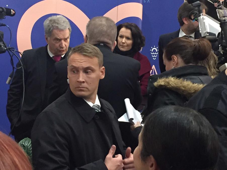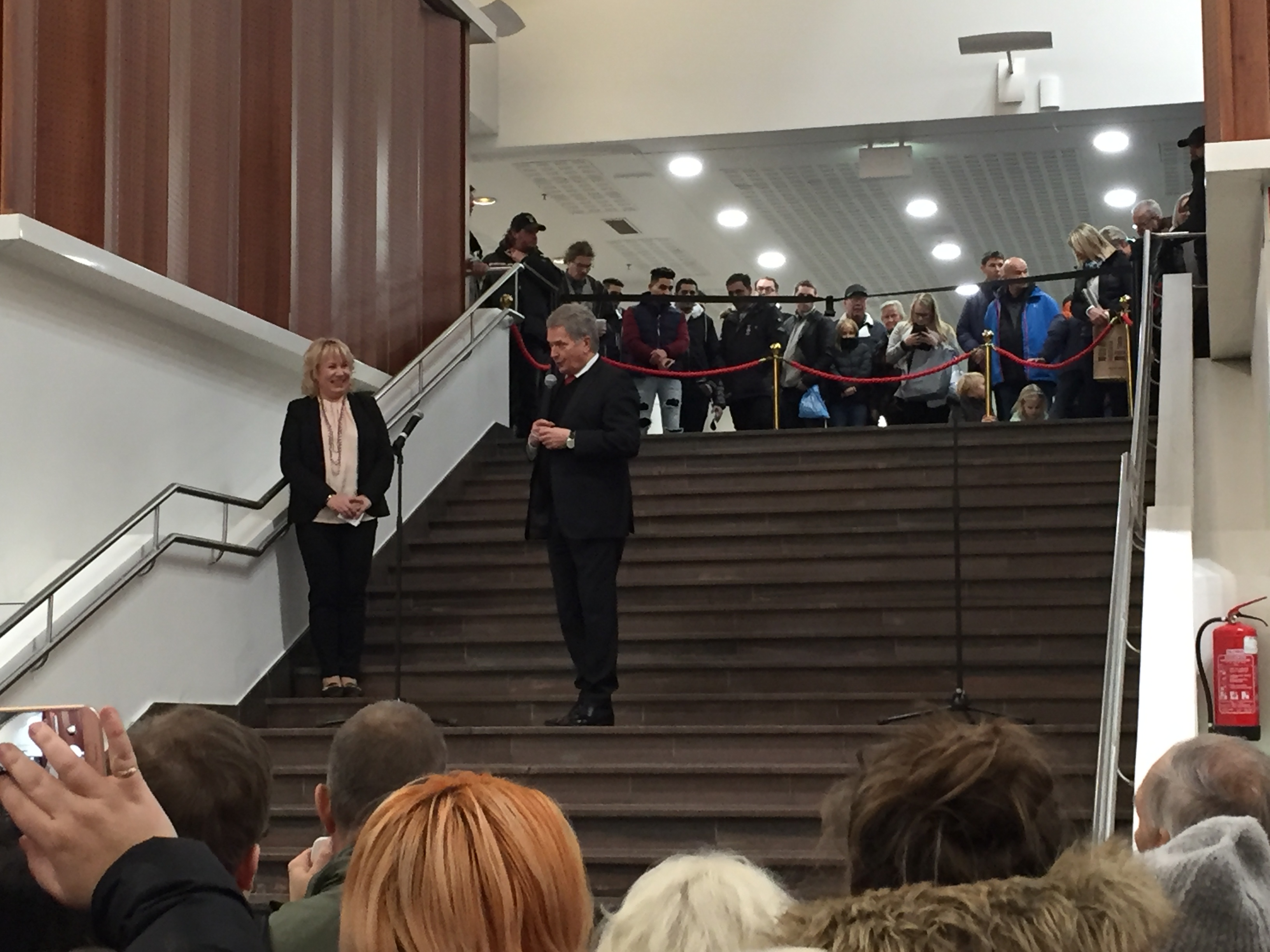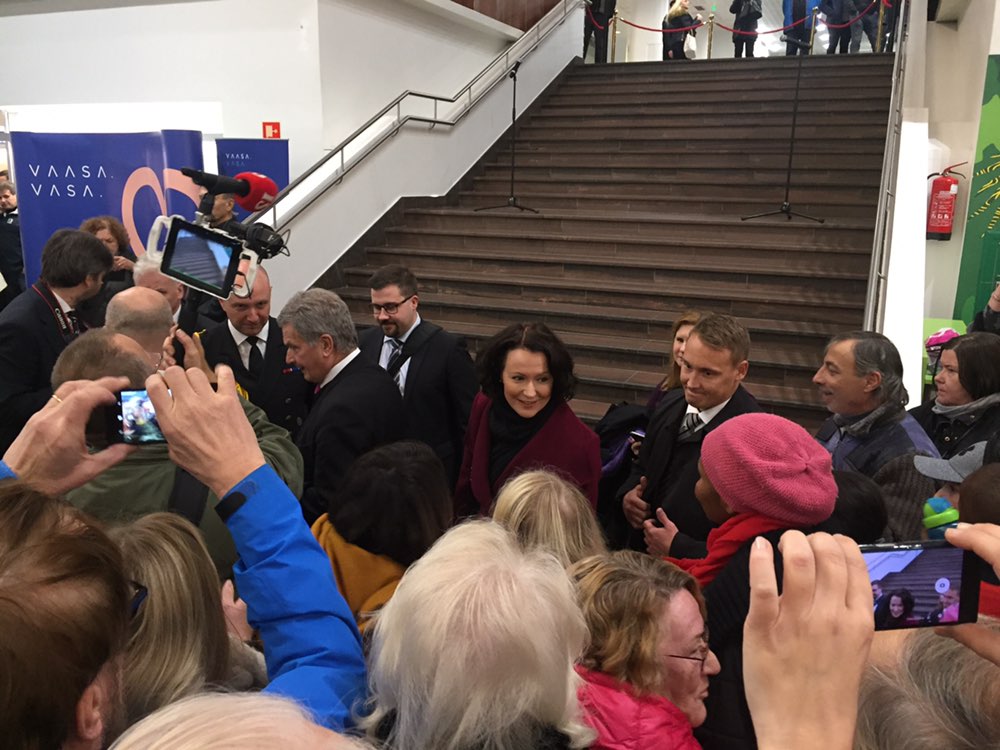 Президент с супругой приехали с опозданием в несколько минут. Минут двадцать президент читал речь и отвечал на официальные вопросы от председателя горсовета Кима Берга и главного редактора местной газеты Стига Нюгорда. Я пока плохо понимаю финский на слух, но вопросы обсуждались ожидаемые — перспективы энергетического машиностроения в регионе в свете изменения климата, инвестиции в завод Вяртсиля, участие Финляндии в учениях НАТО, новый паром в Швецию, а еще у президента спросили про здоровье сына Ааро, родившеся около полугода назад. Президент выглядит в жизни точно так же, как и на всех своих фотографиях, слегка застенчивым, но оратор он хороший. Так как у нас двуязычный город (Вааса), местами президент говорил также по–шведски, хотя и с видимыми усилиями.