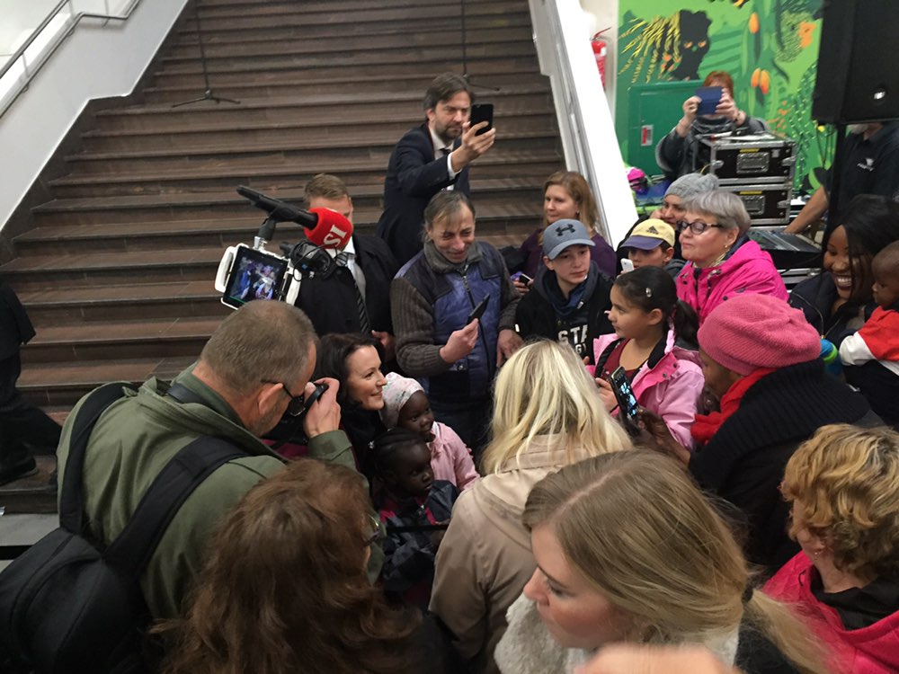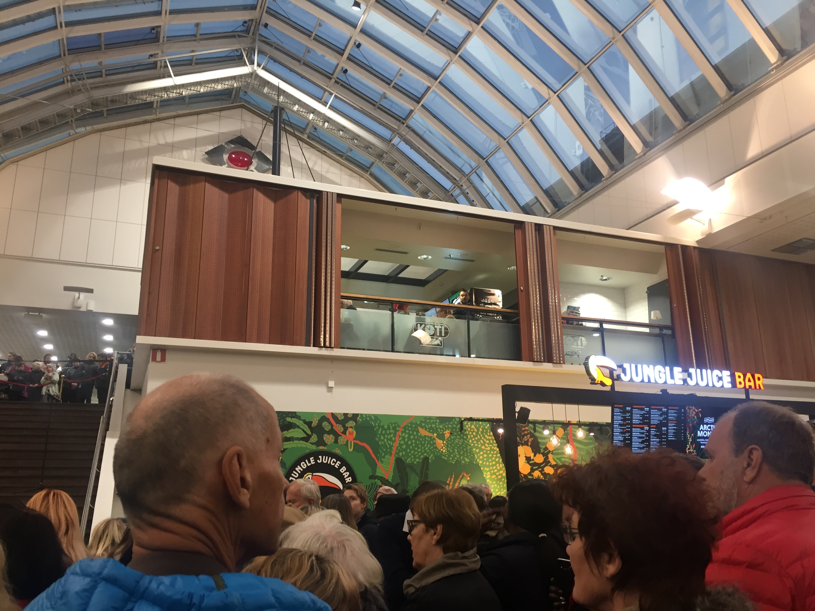 В ТЦ собралась изрядная толпа, а вокруг стояли фургоны телевизионщиков. Никакого досмотра или рамок не было и в помине, только пара полицейских машин, перекрывших проезд к зданию. Сцены или чего–либо подобного в этом ТЦ нет, так что микрофоны поставили прямо на лестнице.