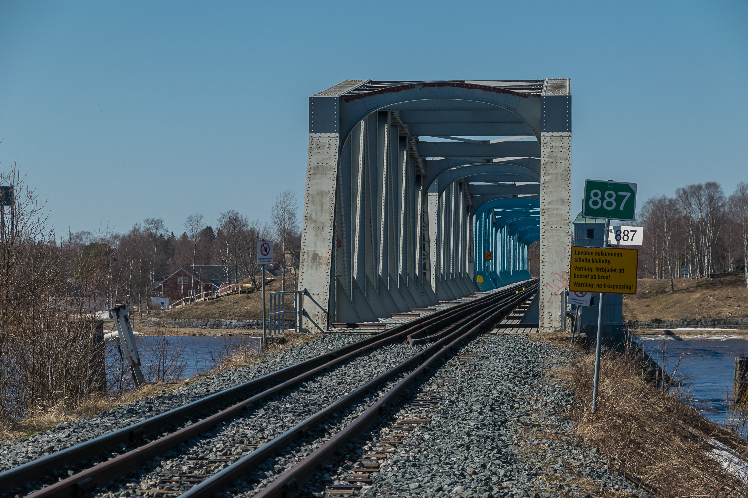 Железнодорожный мост между Торнио и Хапарандой был построен в 1919 году. Так что, хотя Ленин возвращался здесь железной дорогой через Швецию и Финляндию в Россию в 1917, тогда еще реку ему пришлось пересекать иными способами :) Длина моста составляет 245 м, из них большая часть формально шведская сторона, лишь пара пролетов финские (хорошо заметно по разному оттенку краски). Мост изначально являлся разводным; один из пролетов мог вращаться в горизонтальной плоскости. Практического смысла в этом было мало (выше Торнио и Хапаранды река Торне несудоходна из–за многочисленных порогов), этой возможностью пользовались крайне редко, и в 1985 году разводной механизм был демонтирован.