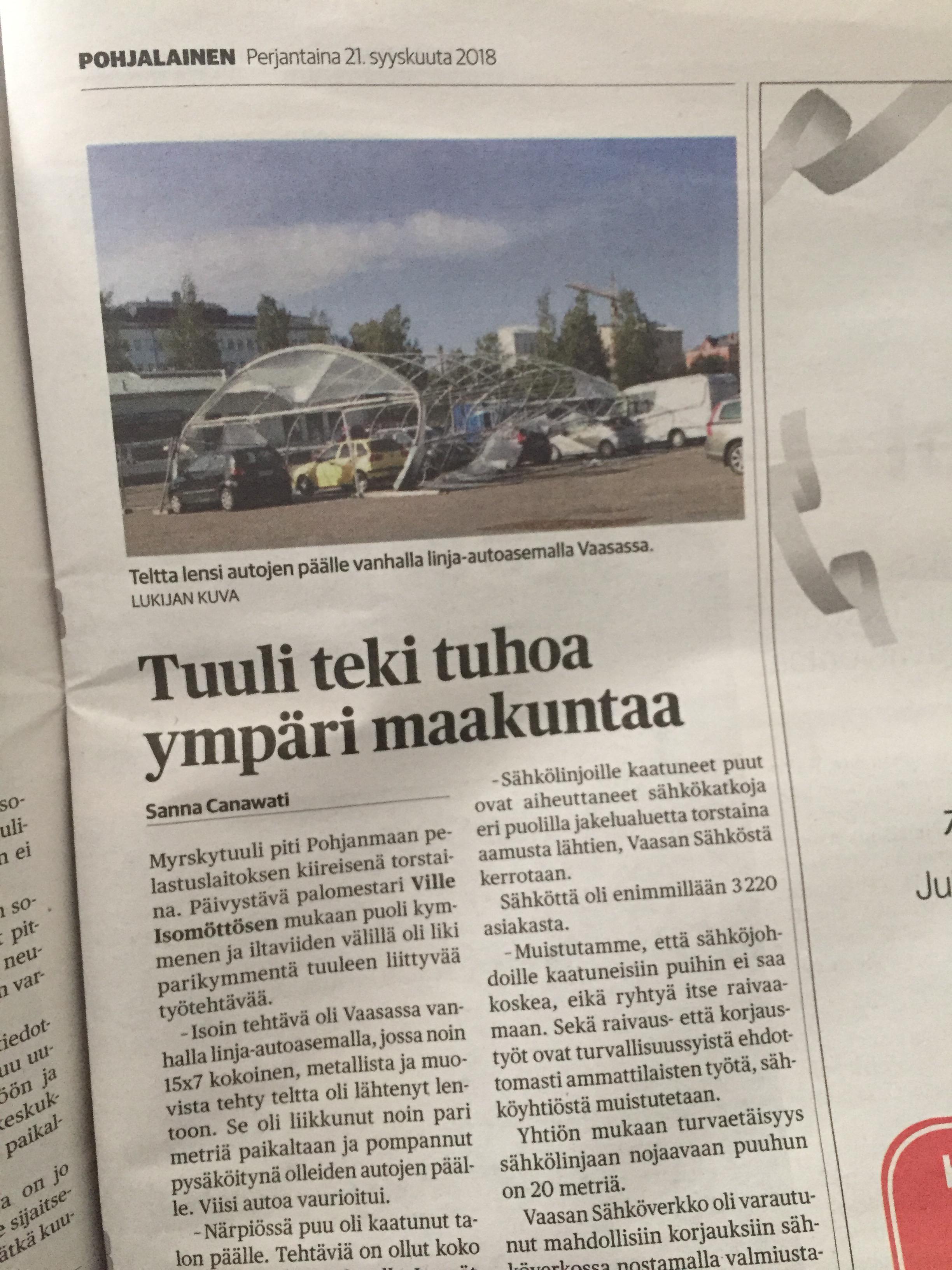 Справку я попросил у пожарных по электронной почте. На самом деле я втайне даже немного надеялся, что они скажут, что по почте такое не высылают, и мне придется сходить в пожарную часть лично (ну, интересно же! я никогда не был в пожарной части), но вместо этого секретарь (?) Тармо мне дал адрес того самого начальника взвода Вилле, а тот через пару дней таки прислал PDF со справкой, точнее, целый краткий рапорт о просшествии на финском. Самое важное там было — номера пострадавших машин, и имя и контакты владельца тента — это было ООО; судя по названию, небольшое — называющееся в честь своего владельца по имени Том. Я немного посочувствовал Тому, ему теперь платить за ремонт пяти машин. Или не ему? Может, такой ветер считается форс–мажором? В таких нюансах я был не силен. Но в любом случае страховая должна была помочь.