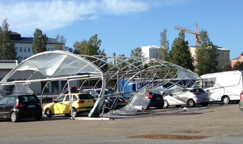 Порывом ветра каким–то образом подняло этот тент, как парус, переместило на несколько метров, и уронило его (и окружавший его забор) на припаркованные машины. Всего пострадало пять машин, включая мою. Прохожий, свидетель происшествия, позвонил 112, и через 5 мин на место прибыли пожарные. По счастью, никто не пострадал, но для извлечения машин из–под конструкции потребовалась спецтехника.