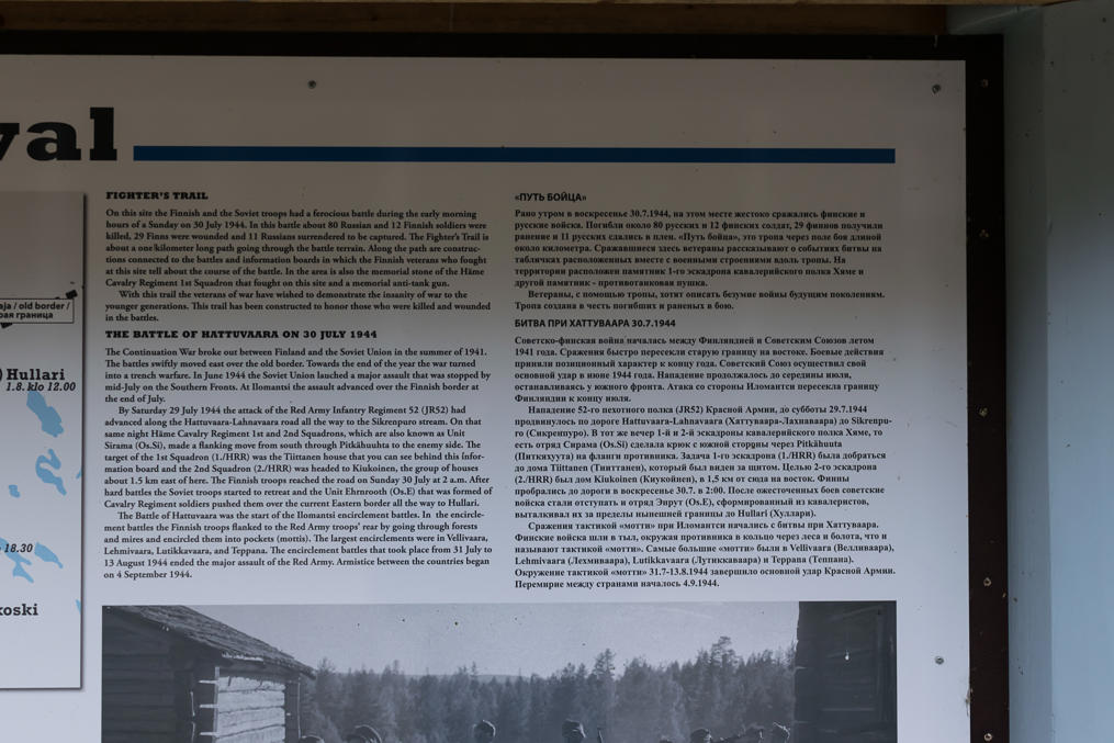 Дорога к границе пересекает несколько пеших троп и проходит мимо памятника небольшой Хаттуваарской битве 30.7.1944; под самый конец Войны-Продолжения советские войска пересекли современную границу Финляндии в Северной Карелии, и в районе Иломантси есть ряд воинских памятников. В конце можно оставить машину на разворотном кольце для лесовозов и пройти пешком до берега озера. В ста метрах от берега на маленьком островке хорошо видны сине–белый финский и красно–зеленый российский пограничные столбы (на фото чуть правее середины). Заходить за пределы огороженной "перилами" зоны запрещено, равно как и плавать в озере или ходить по его льду зимой.