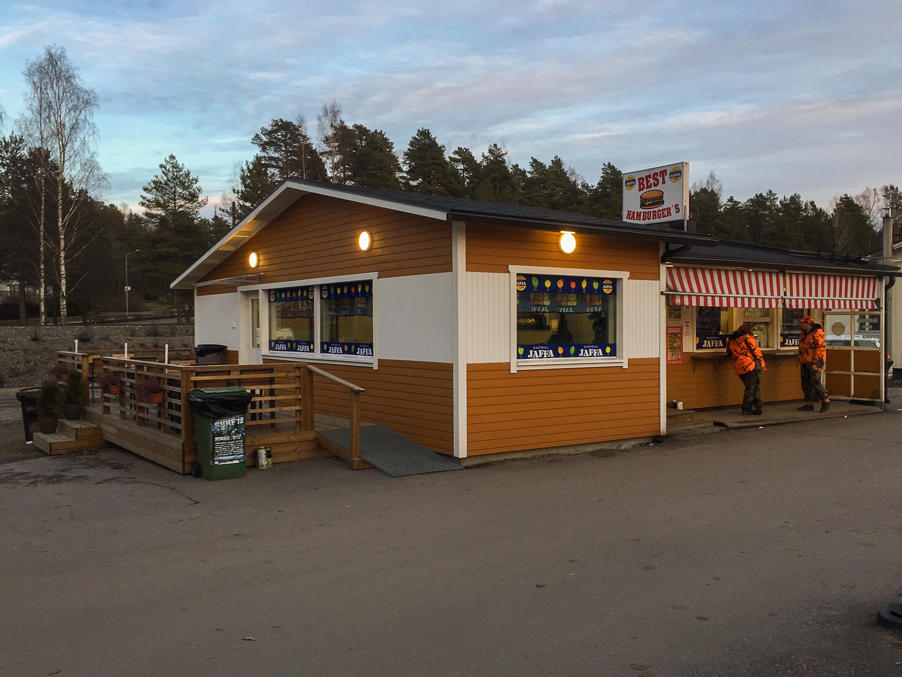 Охотники на лосей перекусывают в киоске в маленьком городке Эхтяри в Западной Финляндии. Середина ноября.