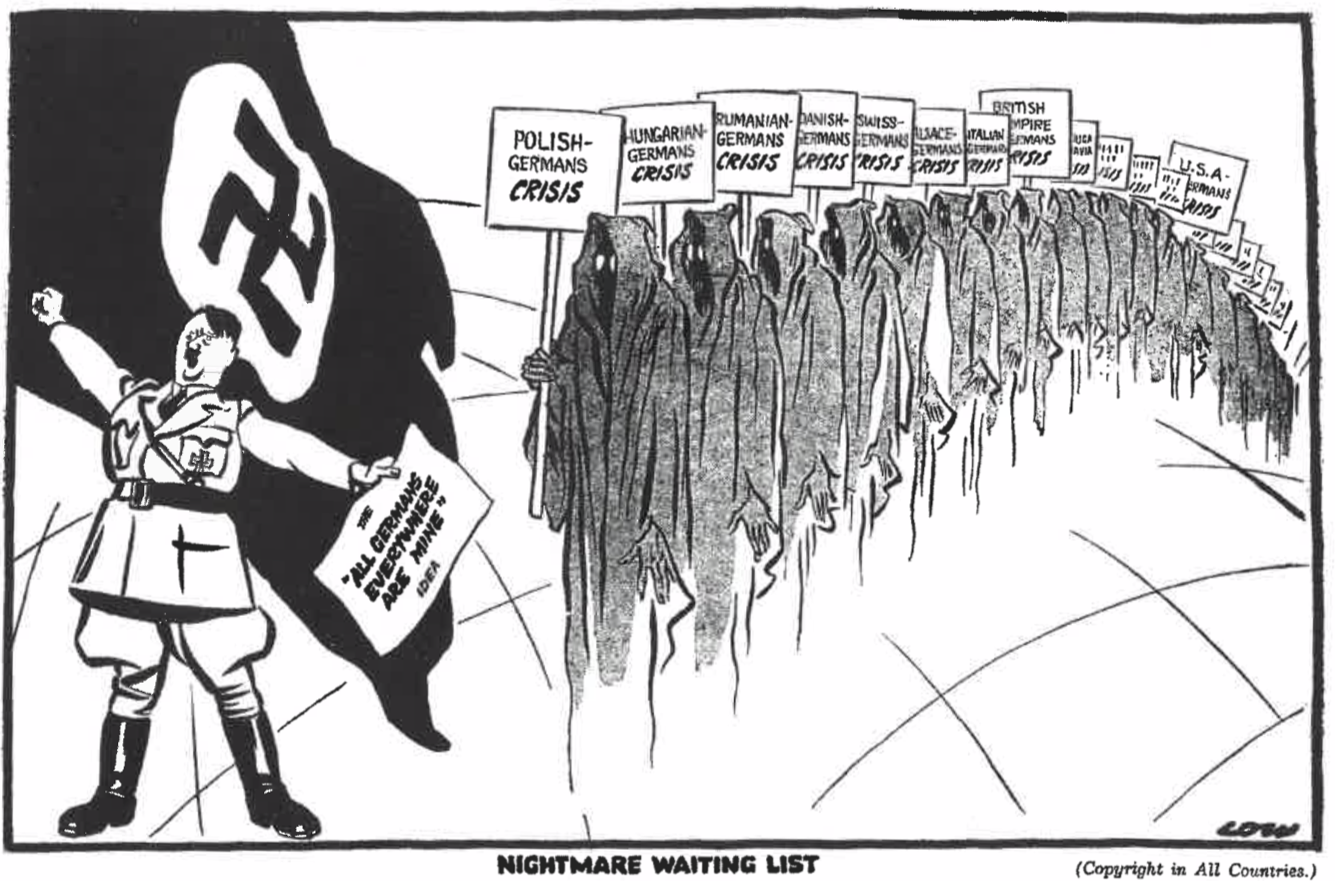 Когда после Первой Мировой войны было образовано Чехословацкое государство, в его состав были включены территории с населением около 3 млн. судетских немцев. Пропаганда Гитлера подстрекала судетских немцев требовать себе больших прав. Чехословацкое правительство крайне неохотно соглашалось на требования, но в конце концов согласилось предоставить территории автономию. Это не удовлетворило Германию. Напряжение нарастало, и обе страны привели свои войска в боевую готовность. Из-за воинственного настроения Гитлера мобилизация была объявлена также во Франции и Великобритании.