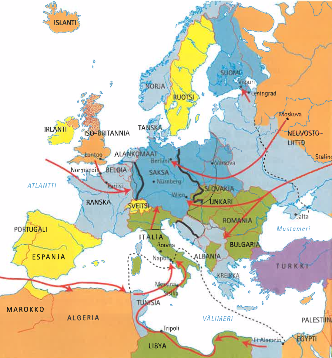 Вторая Мировая война — событие, до сих пор занимающее одно из центральных мест как в российском, так и в финском национальном самосознании. Мне, как человеку, живущему в Финляндии и живо интересующемуся всем, что с ней связано, это обстоятельство давно казалось любопытным. Недавно ко мне в руки попали кое-какие финские школьные учебники, и я решил перевести с финского на русский один из разделов одного из этих учебников — краткое описание Второй Мировой в учебнике Forum III: Kansainväliset suhteet (Международные отношения) 2007 года.