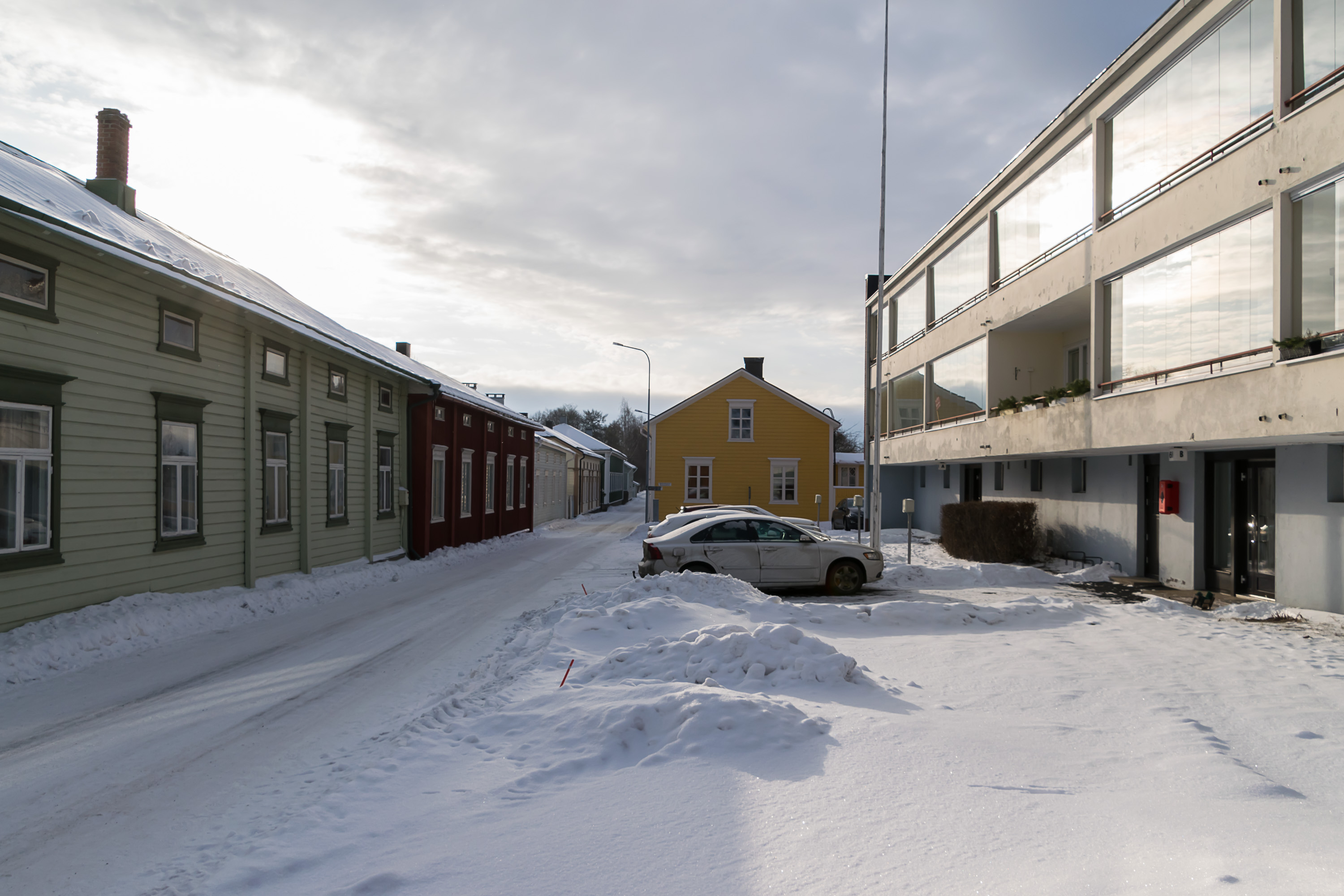 43. Уплотнительная застройка — страшненькая трехэтажка среди старых деревянных домиков. Кристинестад (нас. 7 тыс.). Был здесь спустя полгода, фасады начали чинить