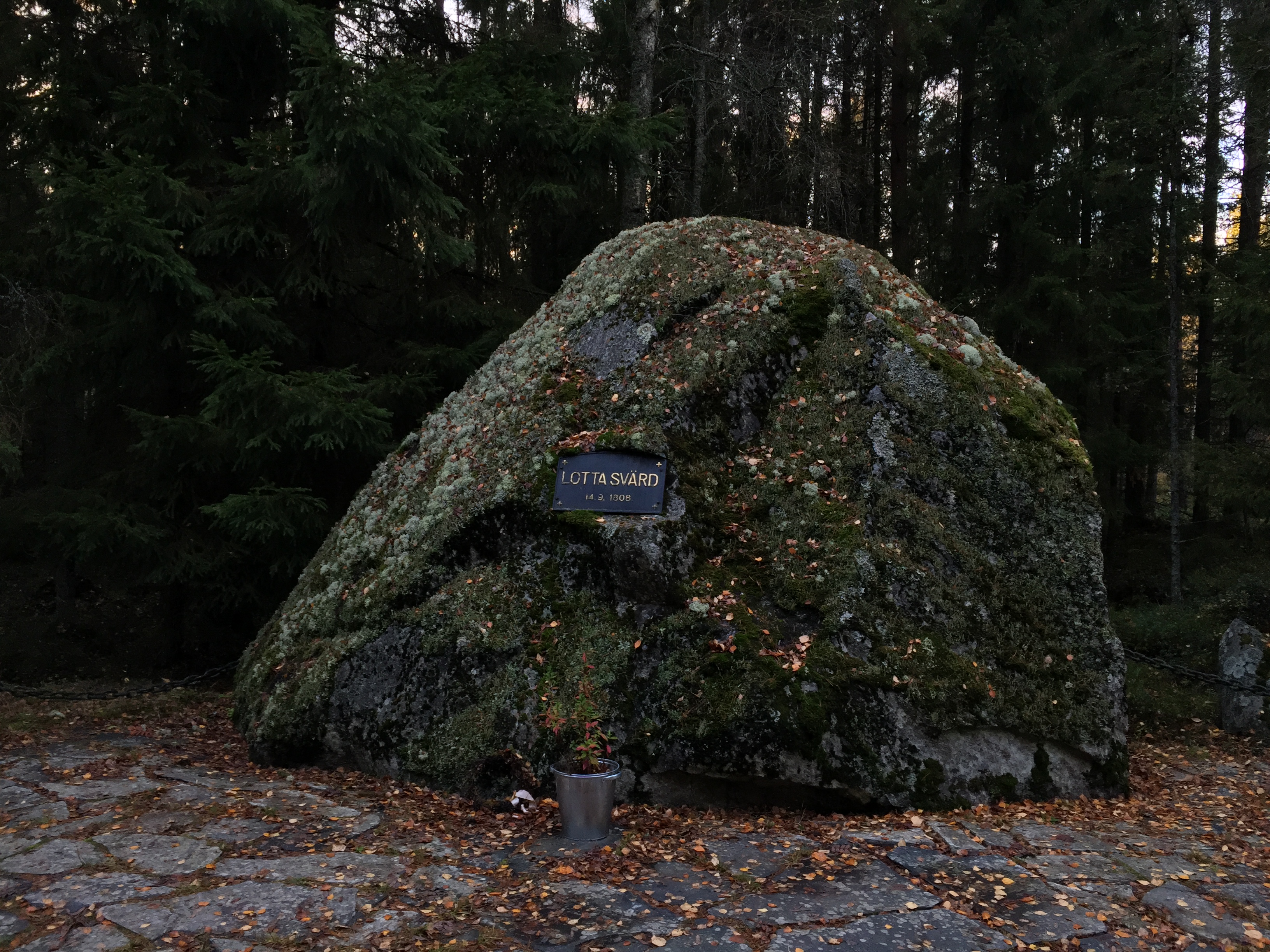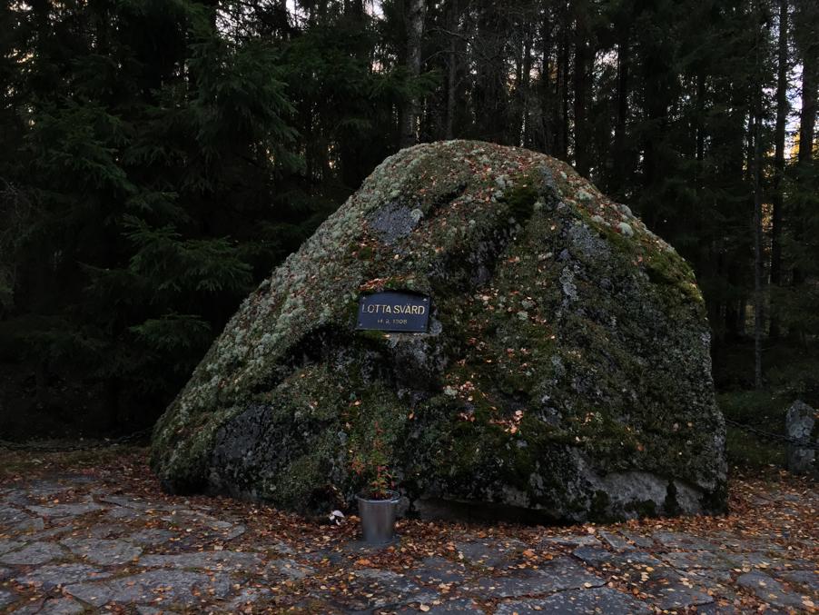 2. Камень Лотты Свярд. Это имя сейчас известно в основном как название финской добровольческой женской военизированной организации, действовавшей в войны 1939–1940 и 1941–1944 годов. Имя это, однако, взято из "Рассказов прапорщика Столя" (1860) Юхана Рунеберга, сборника стихотворений, воспевавших героизм финнов в Финляндской войне. Лотта Свярд — героиня одного из стихотворений, муж которой погиб в бою, и она присоединилась к армии сама — кормила солдат, стирала вещи, ухаживала за ранеными. "Свярд" по–шведски означает "меч". Камень посвящен именно персонажу–Лотте Свярд.