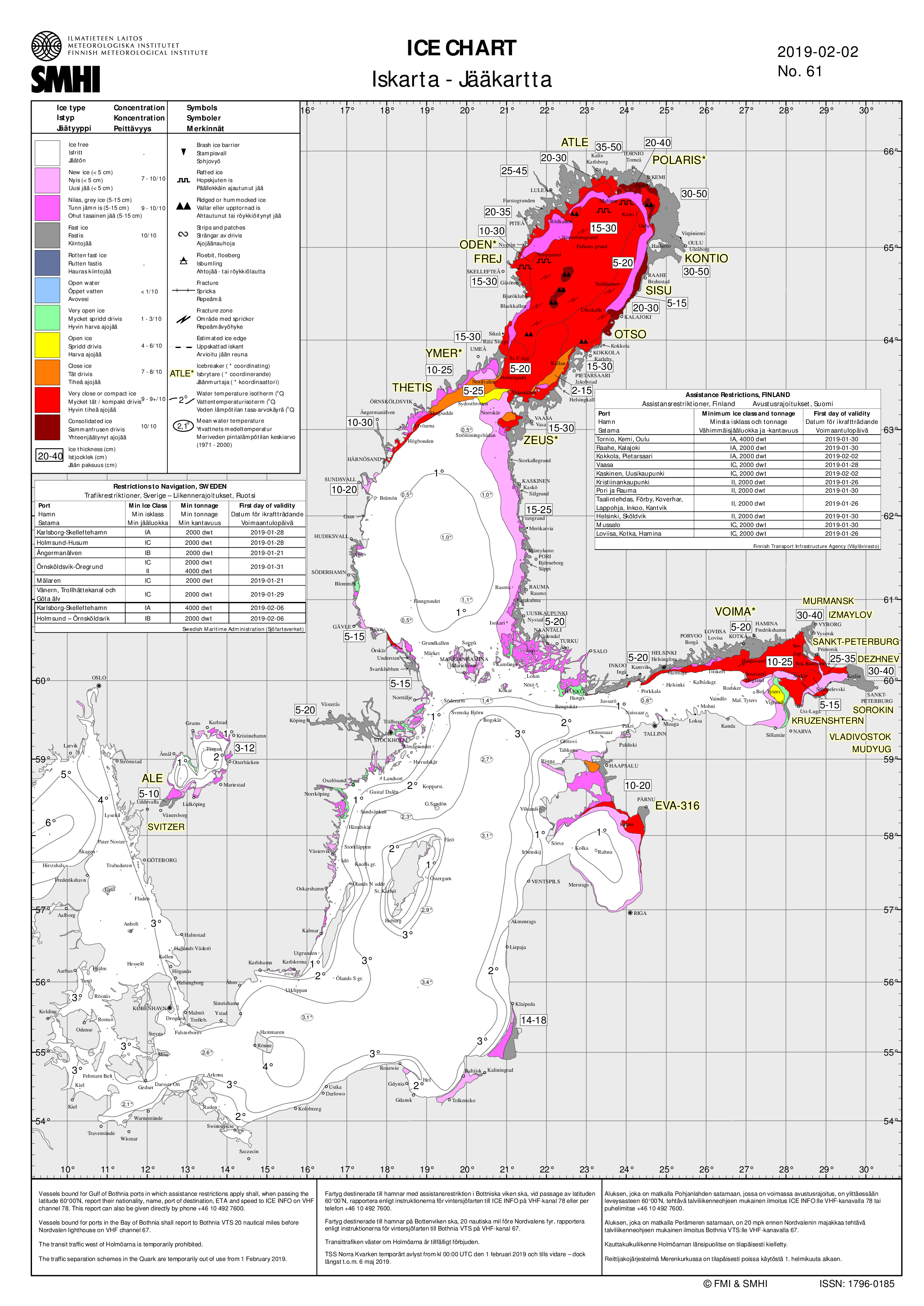 Финская метеослужба начинает публиковать ледовые сводки где–то в ноябре, когда на море появляется первый лед — сначала дважды в неделю, потом, когда лед начинает представлять реальные проблемы для судоходства — ежедневно, вплоть до дней, когда растают последние остатки льда (конец мая–начало июня). Ледовые сводки можно почитать онлайн (по–английски), там же ссылка на PDF с подробной картой ледовой обстановки — если хотите посмотреть детали, лучше открыть его.