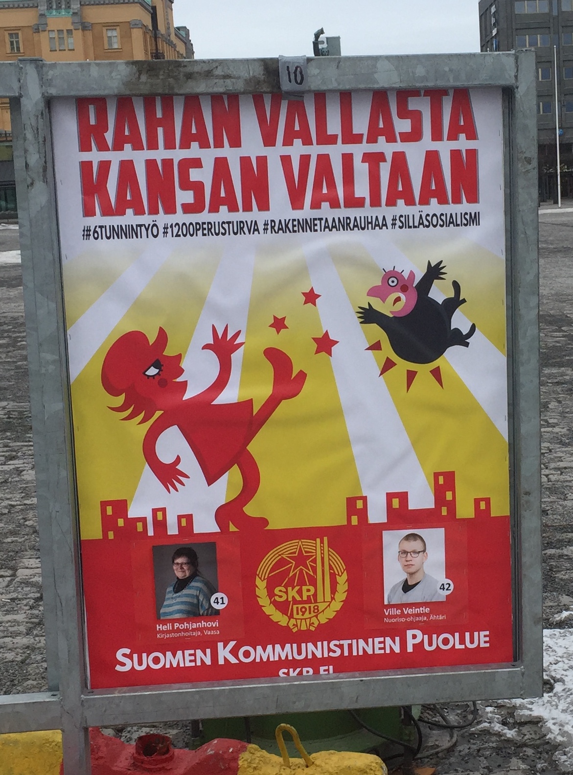 "От власти капитала — к власти народа! #6ЧасовойРабочийДень #МинимальноеПособие1200€ #СтроимМир #ПотомуЧтоСоциализм" Кандидатов в этом избирательном округе у них всего двое, внизу плаката. Слева библиотекарша, справа председатель местной молодежной коммунистической организации. Несмотря на использование символики старой коммунистической партии, впервые разрешенной после поражения в войне в 1944, нынешняя коммунистическая партия была основана лишь в 1996 году. Она не пользуется успехом у избирателей и пока что ни разу не сумела избрать никого в парламент. Во всей стране у нее на данный момент есть только два муниципальных депутата (из 8999 муниципальных депутатов страны).