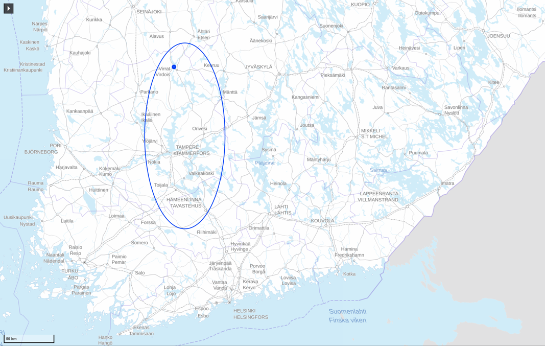 10. Водная система Кокемяэнйоки (большой эллипс) и местонахождение шлюза (точка) на карте Финляндии