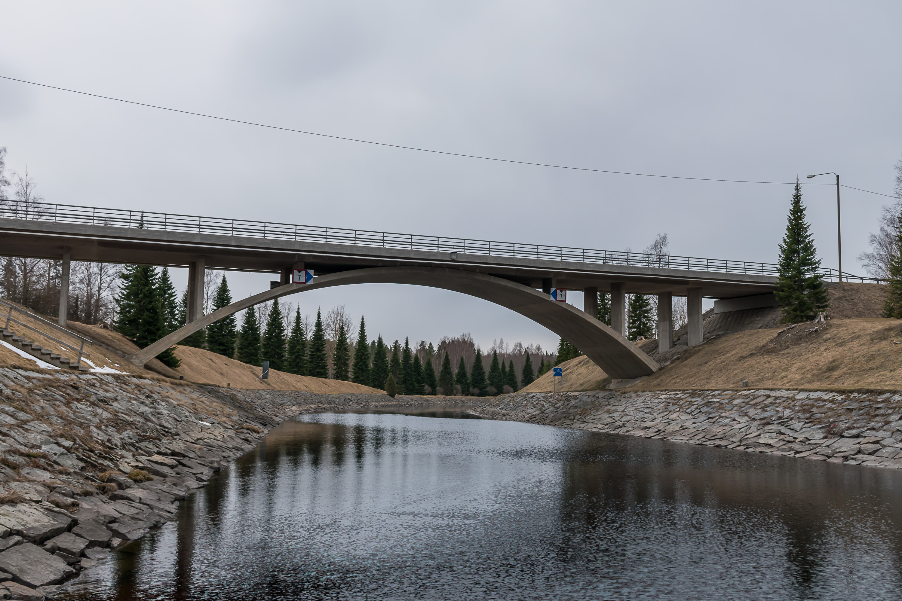 1. Канал. Берега обсажены пихтами. По высокому мосту канал пересекает современная трасса 23 Пори–Ювяскюля