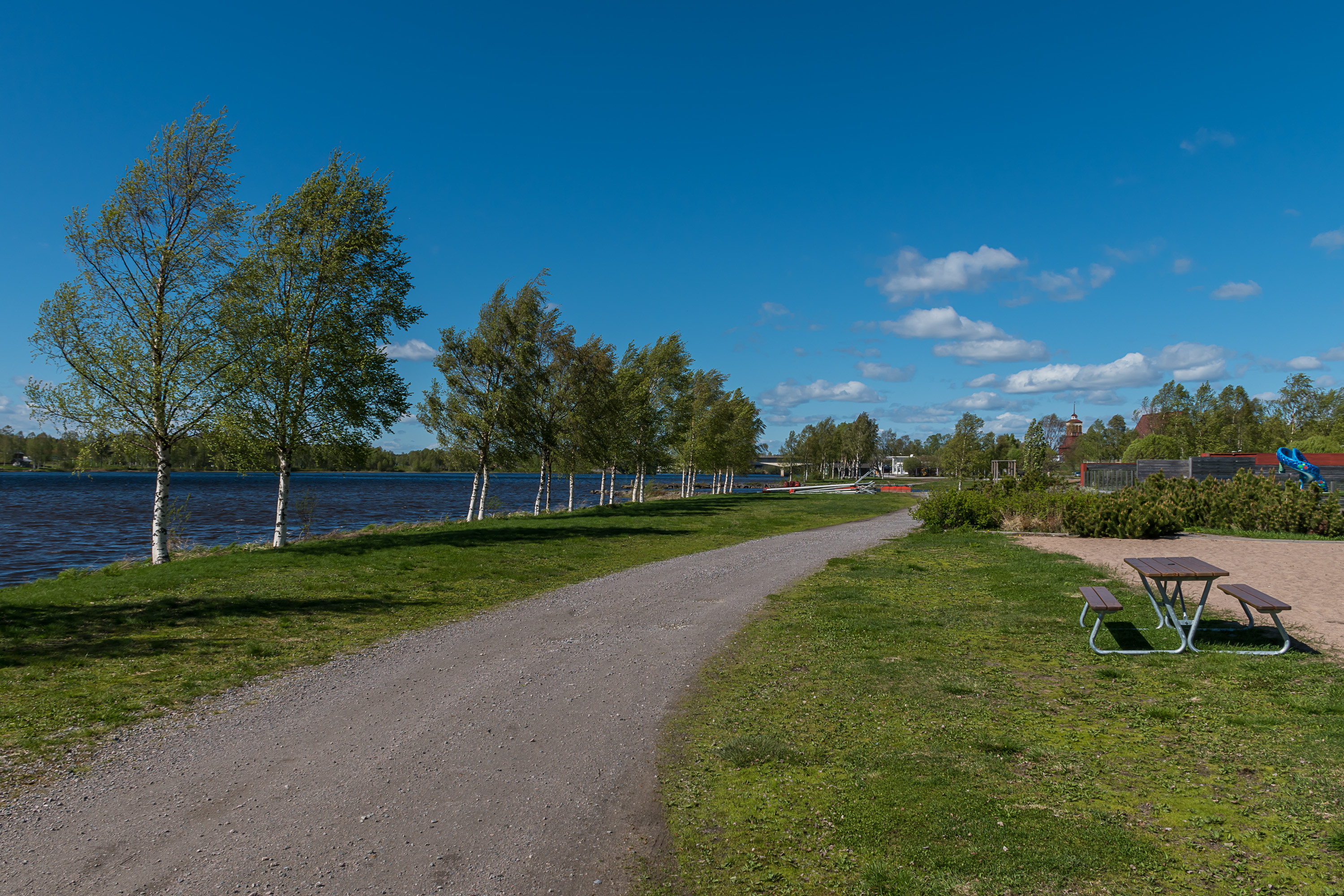 3. Транзитная трасса E4 проходит прямо у центра города. Она отделяет от него полоску земли вдоль берега реки, с кемпингом, спортплощадкой и этим довольно милым променадом. День был солнечный, но очень ветреный и не особо теплый.
