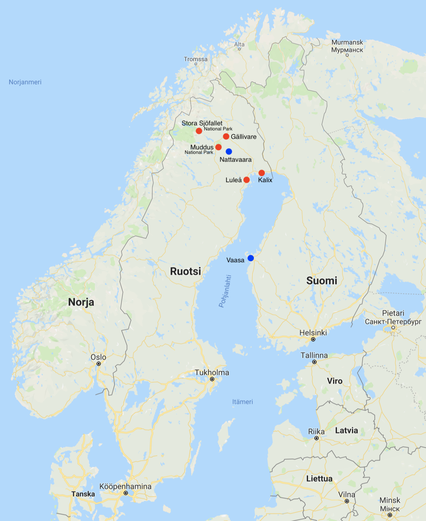 Вот карта мест, которые я посетил. Из Ваасы я выехал, в Наттавааре ночевал две ночи, остальные просто смотрел:
