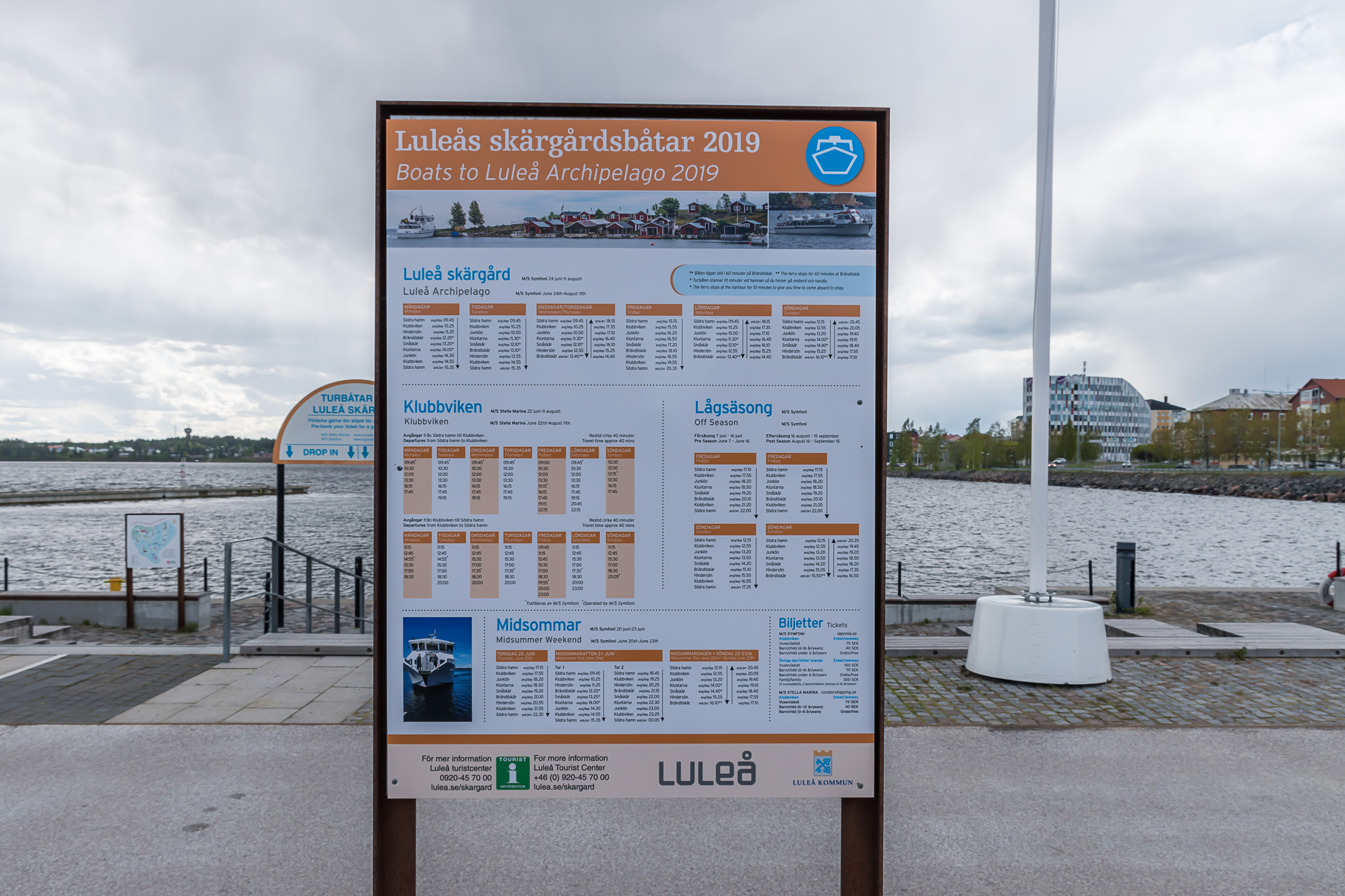 35. Стыдно признаться, но о существовании архипелага Лулео я узнал, только увидев эти расписания рейсов теплоходиков на острова. Но вообще-то, если посмотреть на карту, вдоль северо-западного побережья Ботнического залива и впрямь много островов, где-то от Питео до Хапаранды, а то и до самого Кеми, в Финляндии уже. По-моему, острова ничем особым не примечательны, но, может, я чего-то о них не знаю. В любом случае на момент, когда я здесь был, сезон для теплоходов на архипелах еще не открылся.