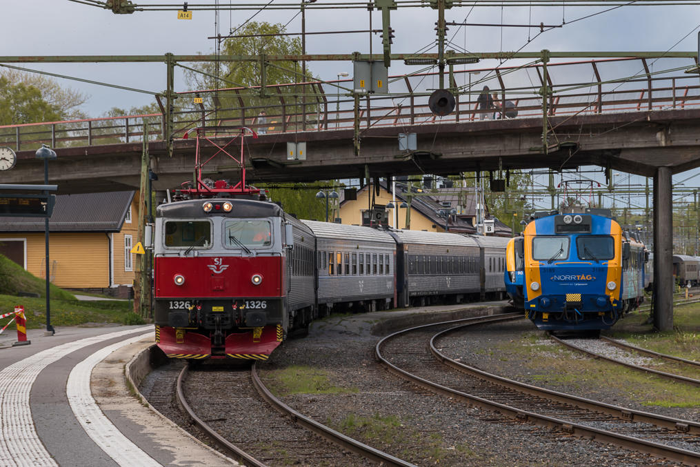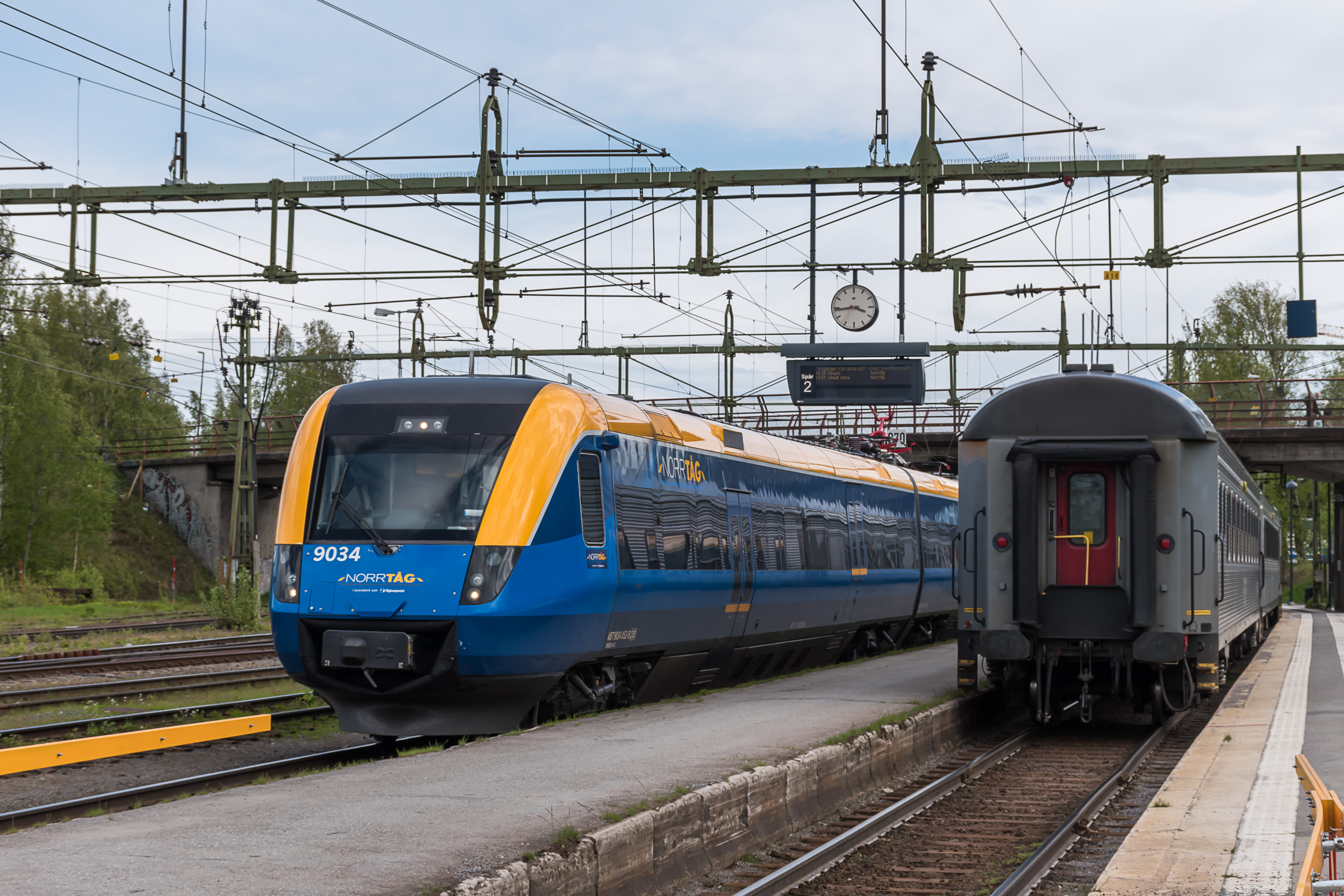 44. А у другой платформы стоял значительно более нового вида региональный поезд "Норртог". Железные дороги в Швеции были приватизированы в 1990-х. Сами пути в основном все же принадлежат государству, а вот подвижной состав — разнообразным компаниям. Ряд таких компаний, в частности, организован губерниями для регионального пассажирского сообщения, и "Норртог" (Norrtåg, Северный поезд) — одна из них. Поезда "Норртог" ходят по большей части всего Норрланда (Северной Швеции), от Сундсвалля до Лулео вдоль берега, и вглубь страны по Рудной и Средней (Mittbanan) железным дорогам. Но до норвежской границы все же вроде не доходят. На этих поездах я тоже не ездил, но мне нравится (относительная) железнодорожная доступность Норрланда; северной Финляндии есть чему поучиться.