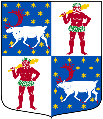 У провинций были свои гербы, и гербы губерний сейчас используют те же изображения, но обычно совмещенные, чтобы показать, что губерния состоит из кусков нескольких провинций. На этом флаге/гербе дикарь — изначальный герб Лаппланда (хоть это и странно; если даже считать саамские народы дикарями — а вполне вероятно, замысел был в этом — в таком наряде по северу все равно не очень-то поразгуливаешь), а бегущий северный олень — герб Вестерботтена. Что тоже странно, учитывая, что современная губерния Норрботтен со старой провинцией Вестерботтен (Västerbotten, Вестроботния) как раз-таки не пересекается, а у старой провинции Норрботтен был отдельный герб, никак тут не представленный... Ну да что поделаешь, геральдика штука сложная.