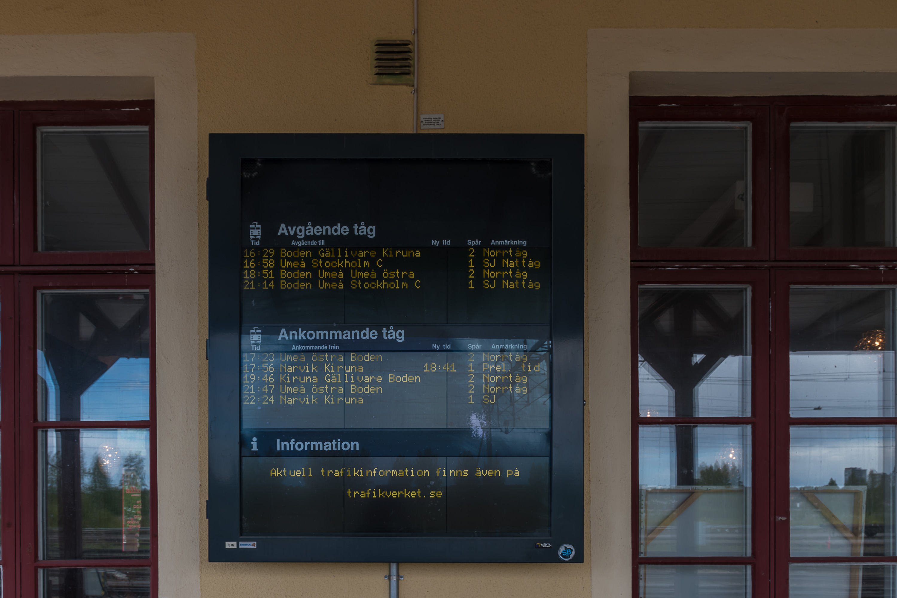 45. Табло поездов. Обратите внимание, что указан оператор — SJ или Norrtåg.
