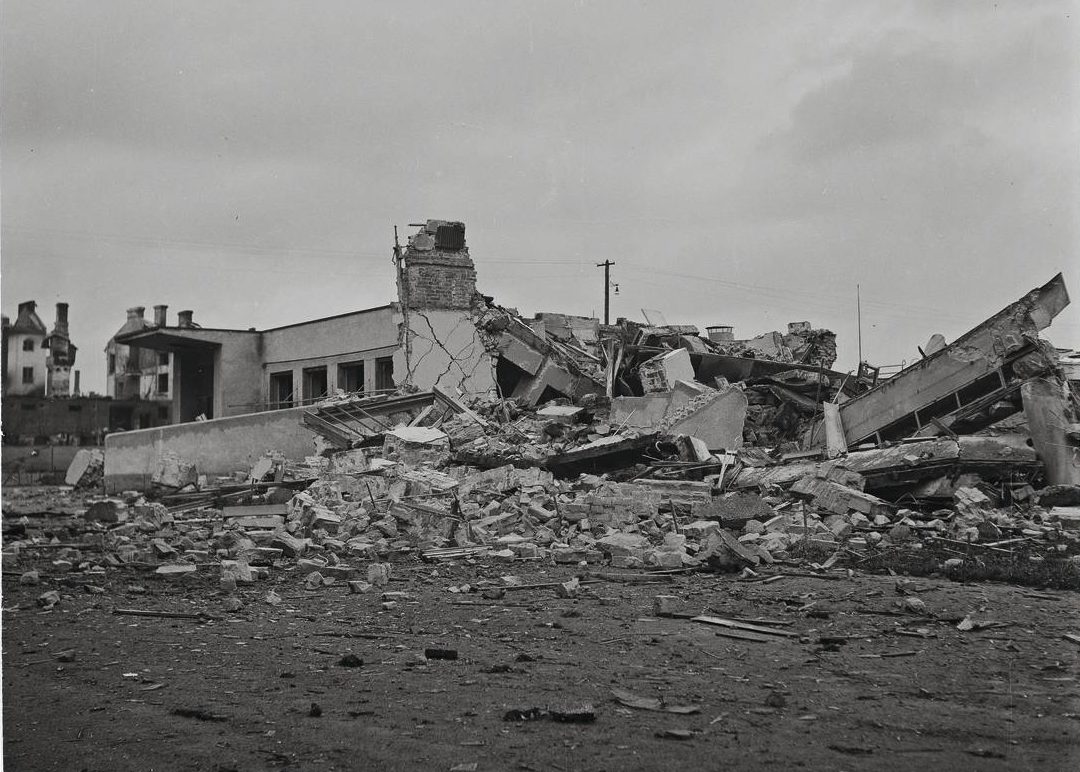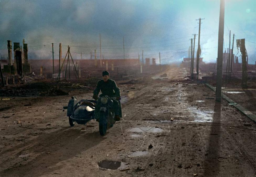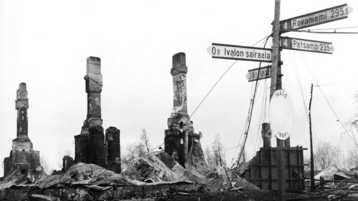 38. Сожженный Ивало. Обратите внимание на старый указатель на Петсамо (Печенгу) — к этому моменту она уже отошла СССР