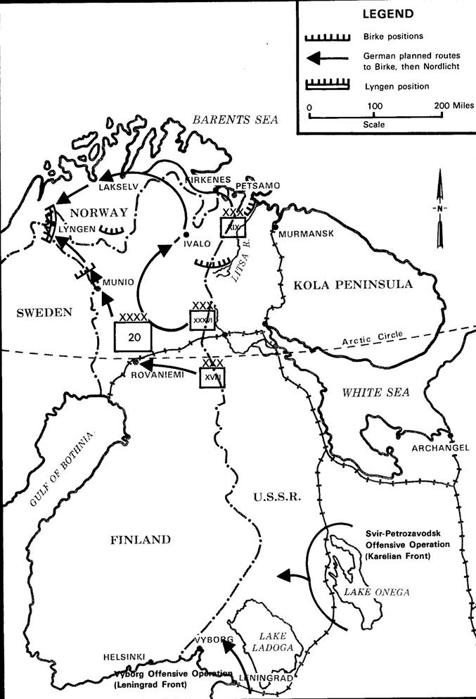 Это была непростая задача. В войне 1941–1944 на всей северной части финско–советского фронта (севернее Оулу) сражались войска нацистской Германии, так как именно здесь у Германии был наибольший стратегический интерес: обезопасить поставки финского Никеля из Петсамо (Печенги), и захватить Мурманск и/или перерезать Мурманскую железную дорогу, чтобы отрезать этот путь снабжения СССР военной помощью союзников. С последней целью Германия в 1941 году попыталась провести операцию "Зильберфукс" (Серебряный лис), состоящую из операций "Платинфукс" (Платиновый лис), нацеленной на Мурманск, и "Полярфукс" (Полярный лис, песец), на Саллу и Кандалакшу. Благодаря героическому сопротивлению советских войск все эти операции потерпели провал, и этот фронт перешел к стадии позиционной войны.