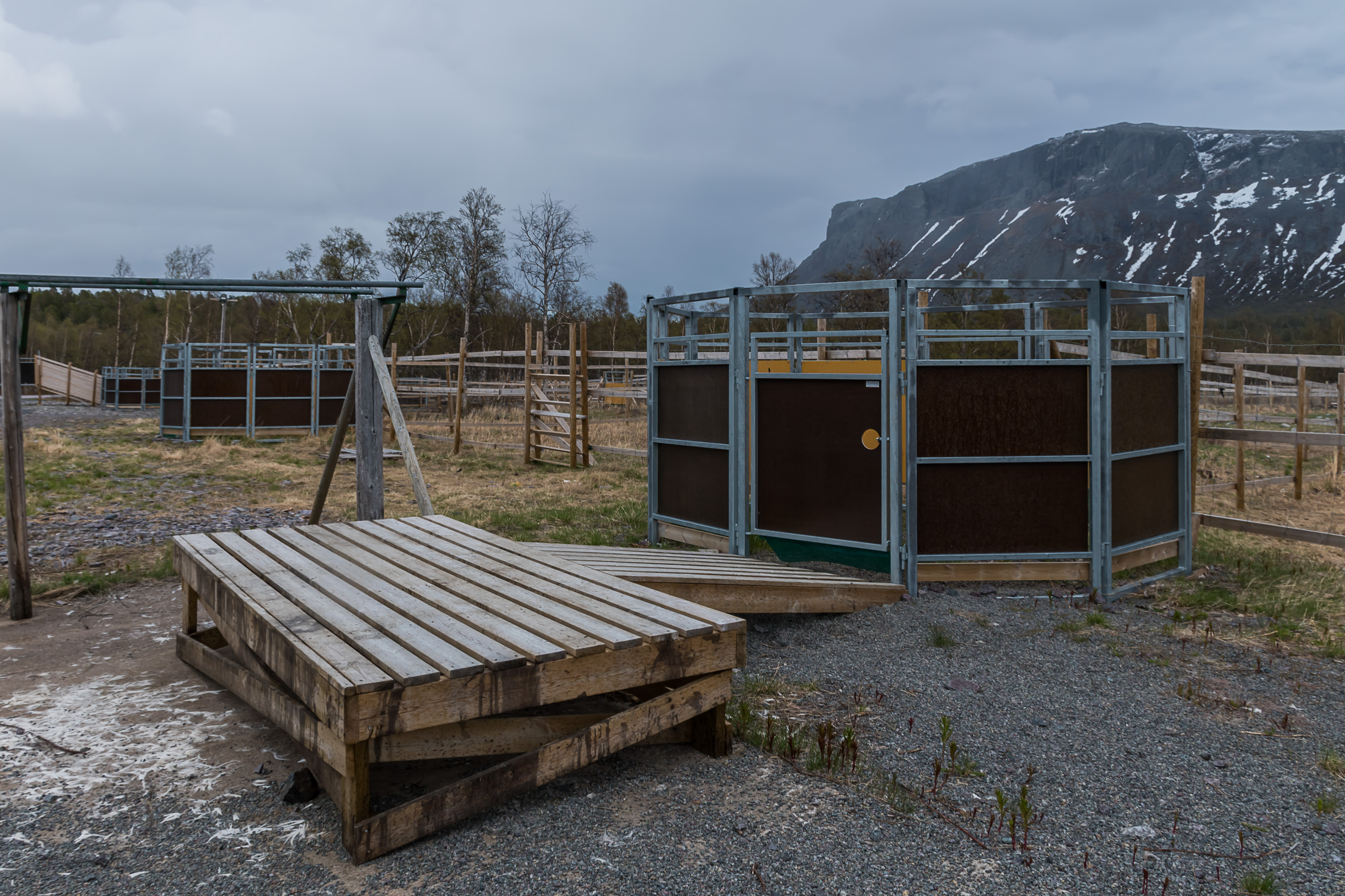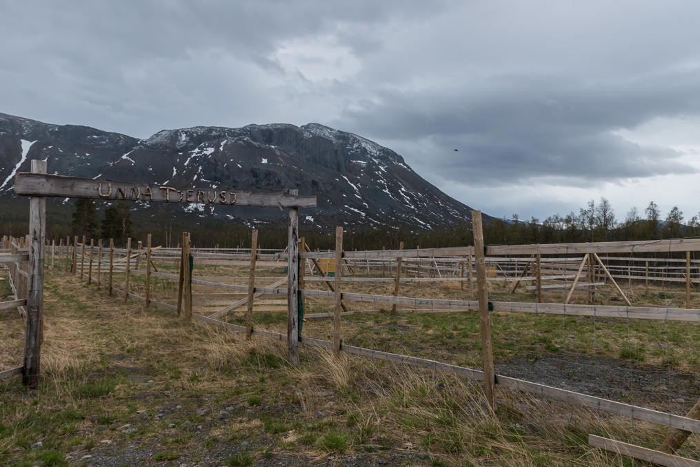 Довольно быстро я доехал вот до этого места. Надпись гласит Унна-черуш (Unna tjerusj), и это — название саамской деревни этих мест ("саамская деревня" — не деревня в общепринятом понимании, а большой кусок дикой территории, используемой для оленеводства и прочих традиционных промыслов саамов). Я не эксперт, но, по-моему, это одно из мест сбора оленей весной (для подсчета оленят) и осенью (для забоя).