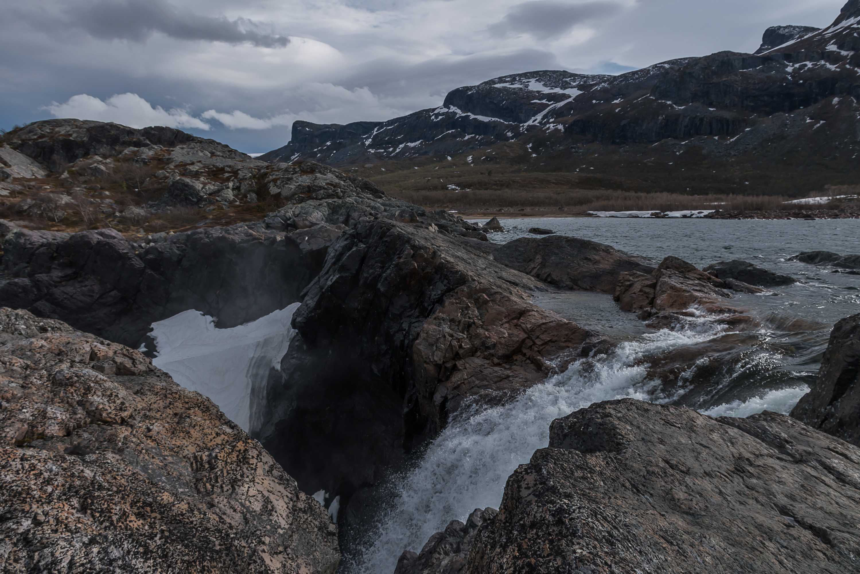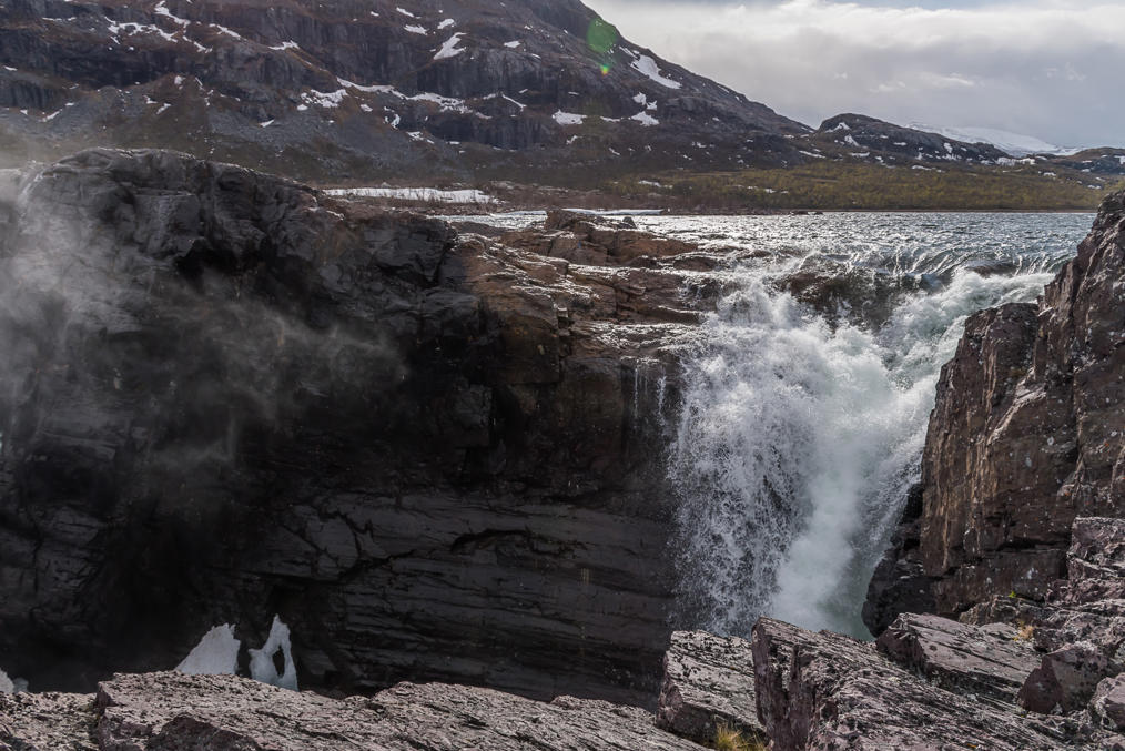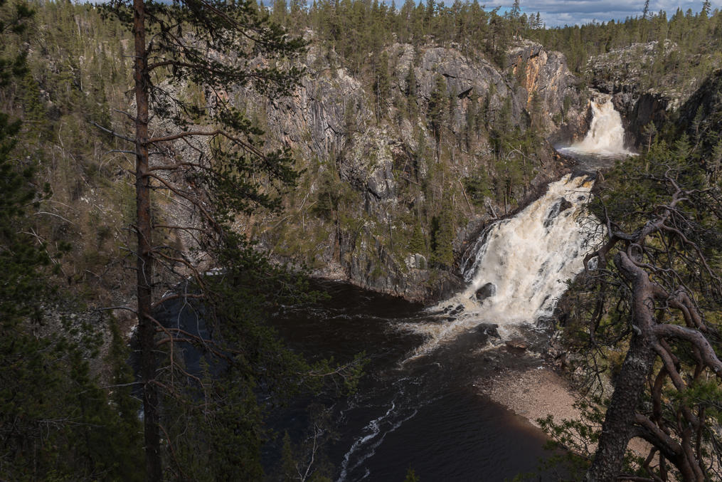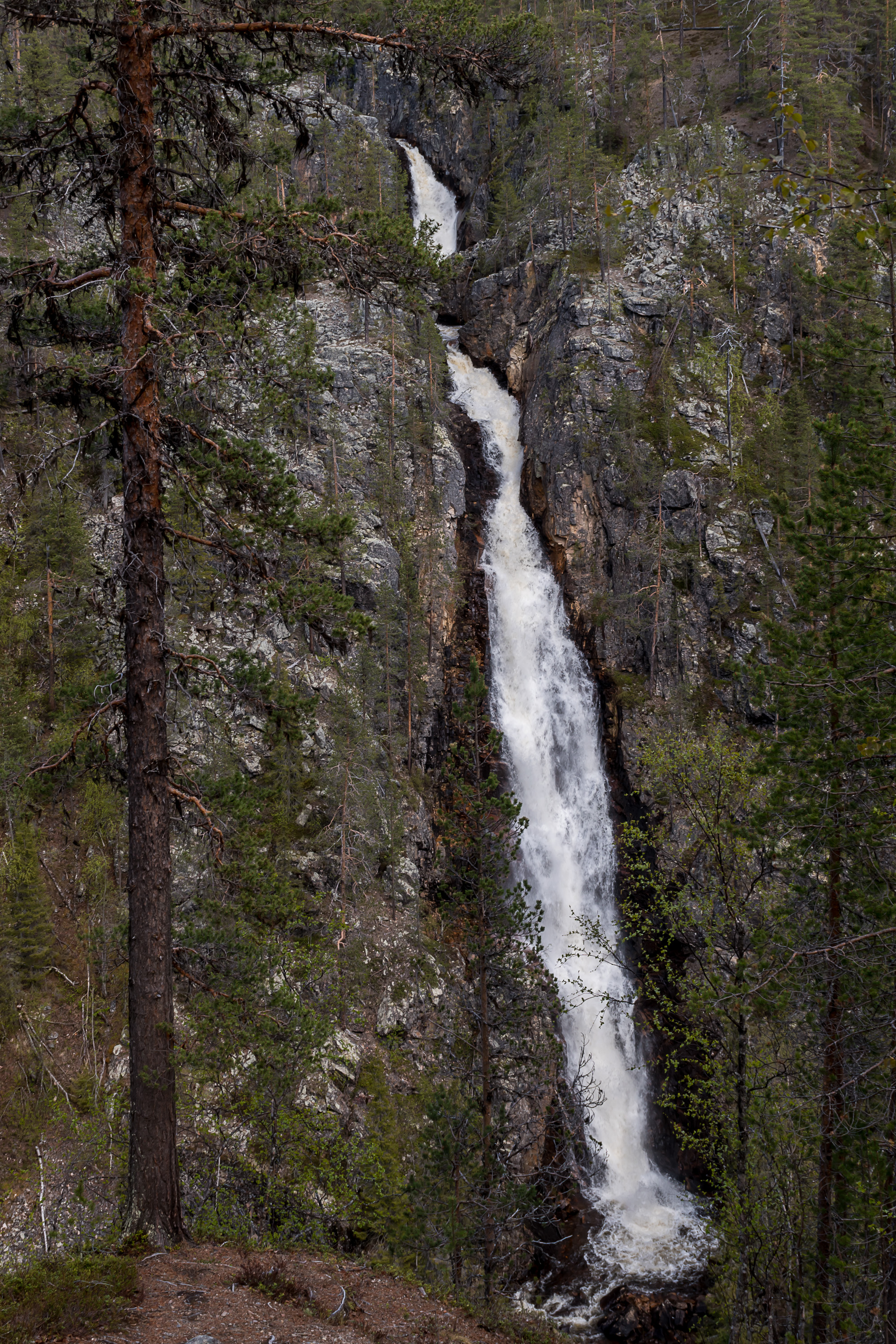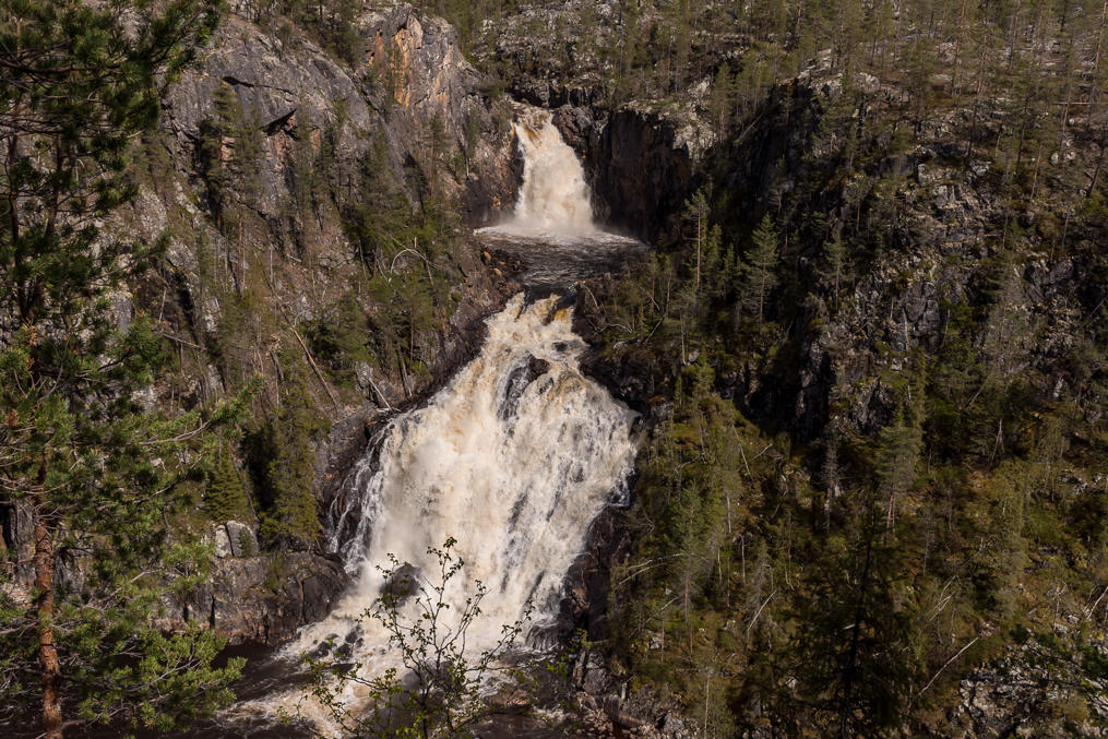 50. И спустя километр или около того — уже тот самый водопад. Здесь Муддусэльвен поворачивает на 90 градусов и падает в каньон двухступенчатым каскадом.