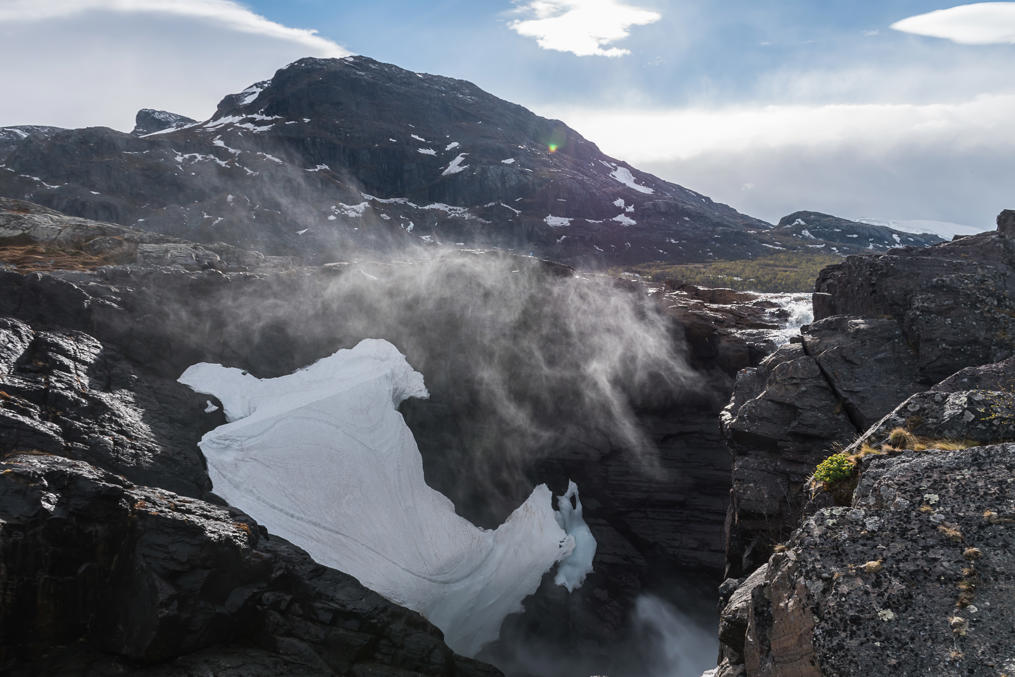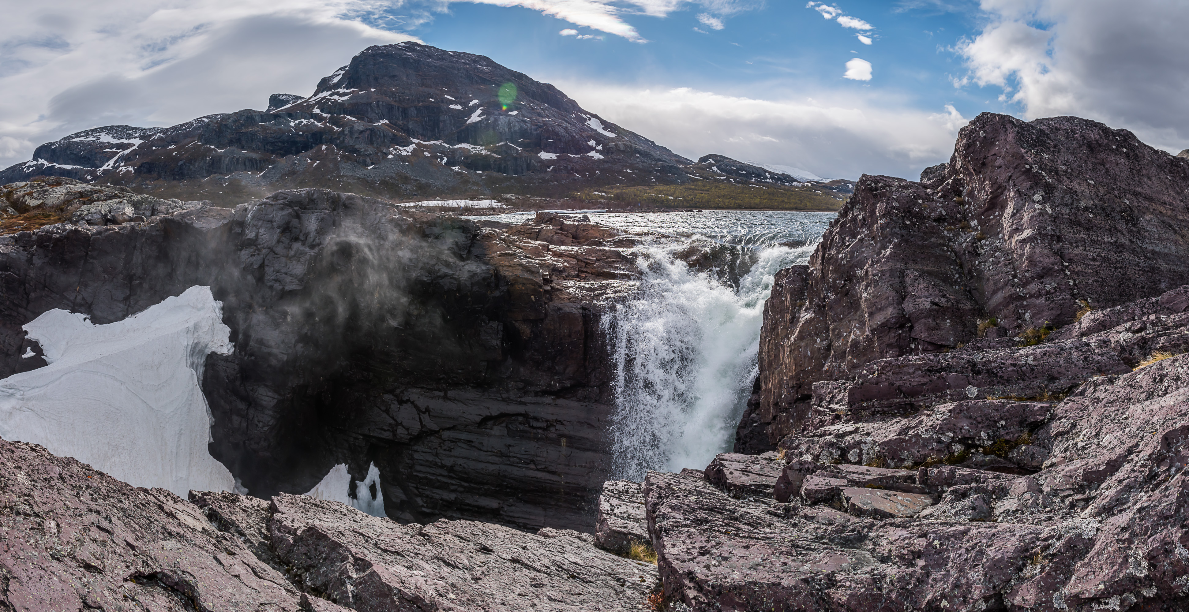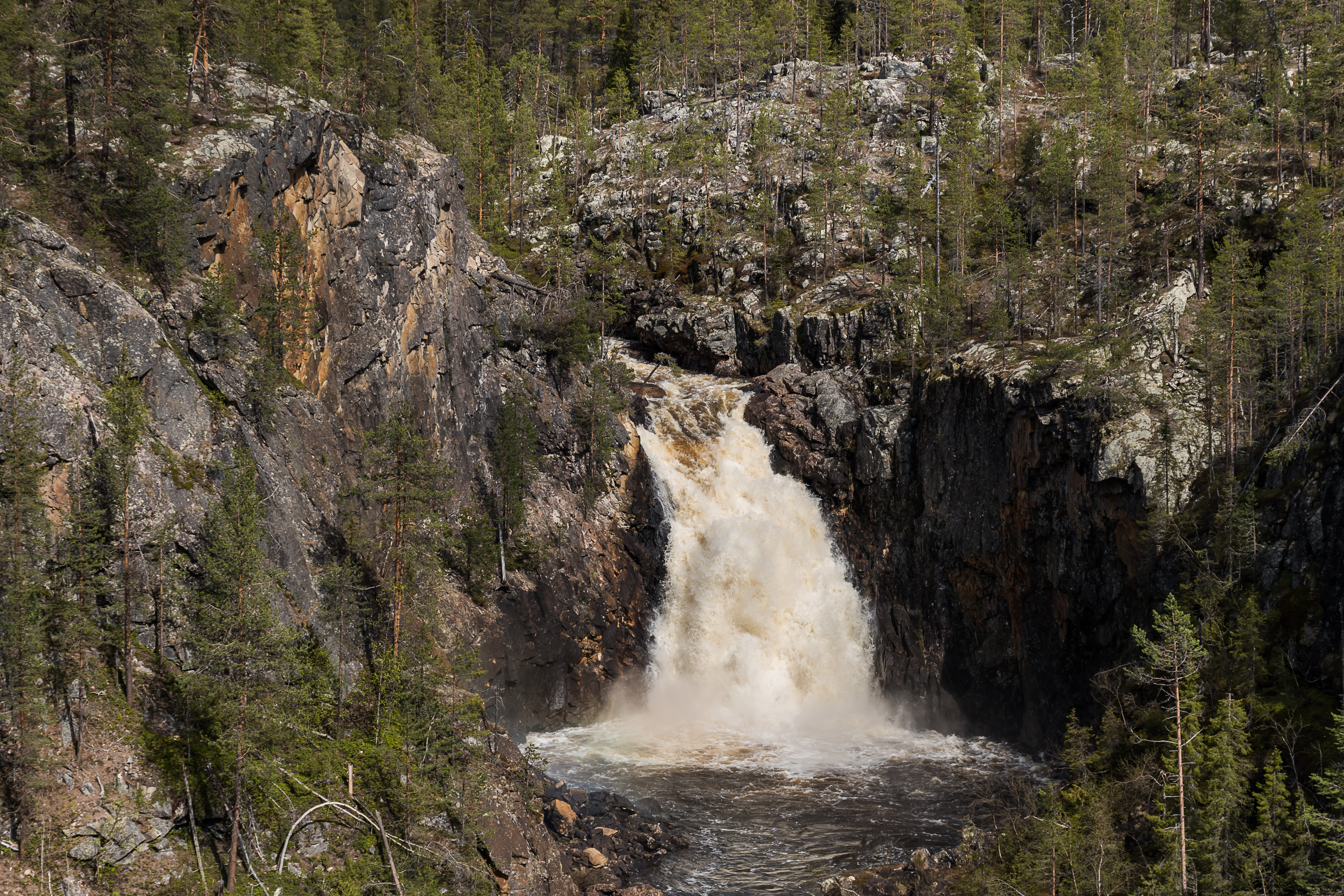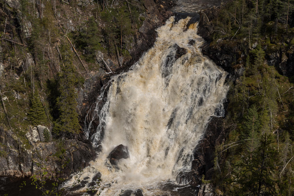 50. И спустя километр или около того — уже тот самый водопад. Здесь Муддусэльвен поворачивает на 90 градусов и падает в каньон двухступенчатым каскадом.
