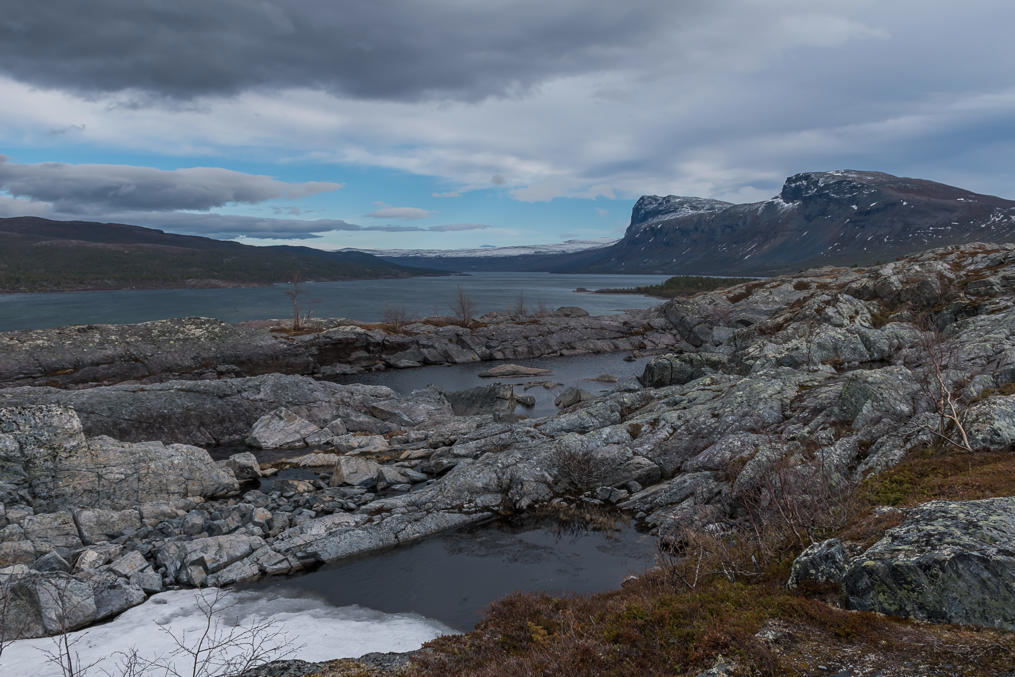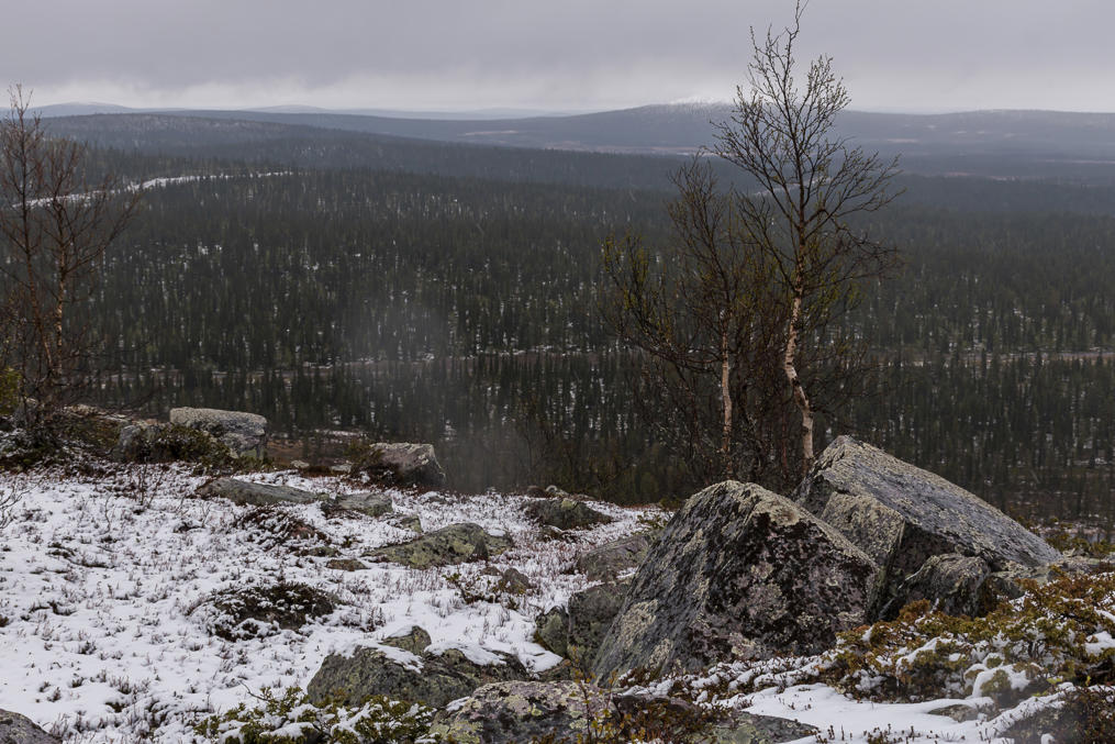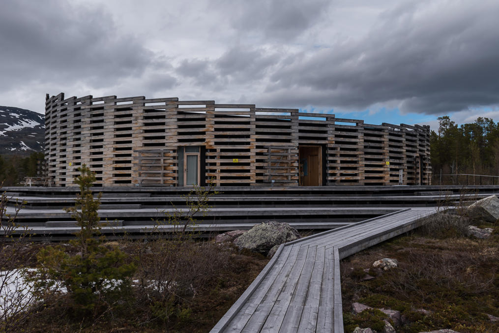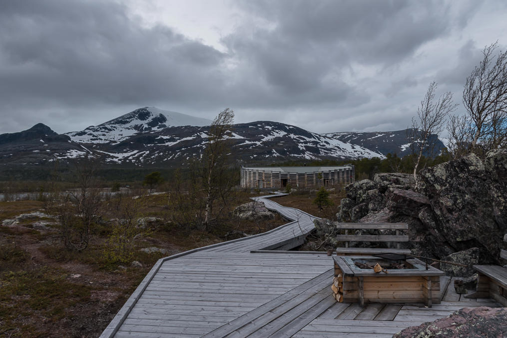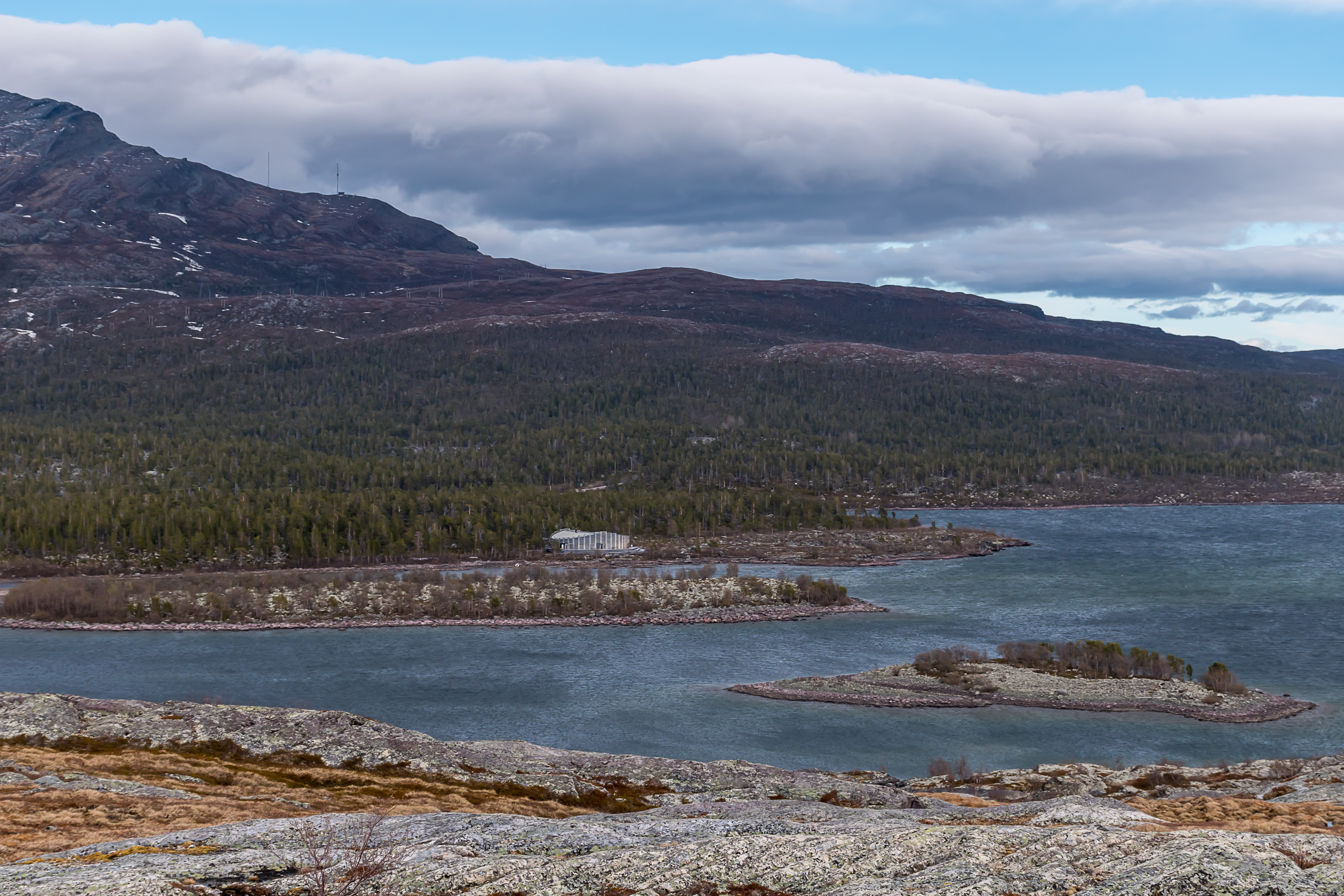 27. Но зато и виды лучше, чем можно было бы подумать! На юго-востоке виден одинокий визит-центр, у подножия горы Юобмочокко (Juobmotjåhkkå). К сожалению, пока я был в визит-центре, погода слегка ухудшилась — не то чтоб сильно, но солнце больше почти не выглядывало.