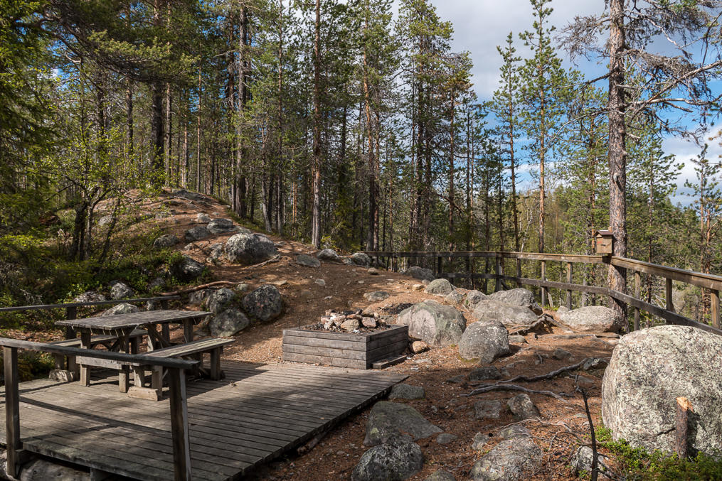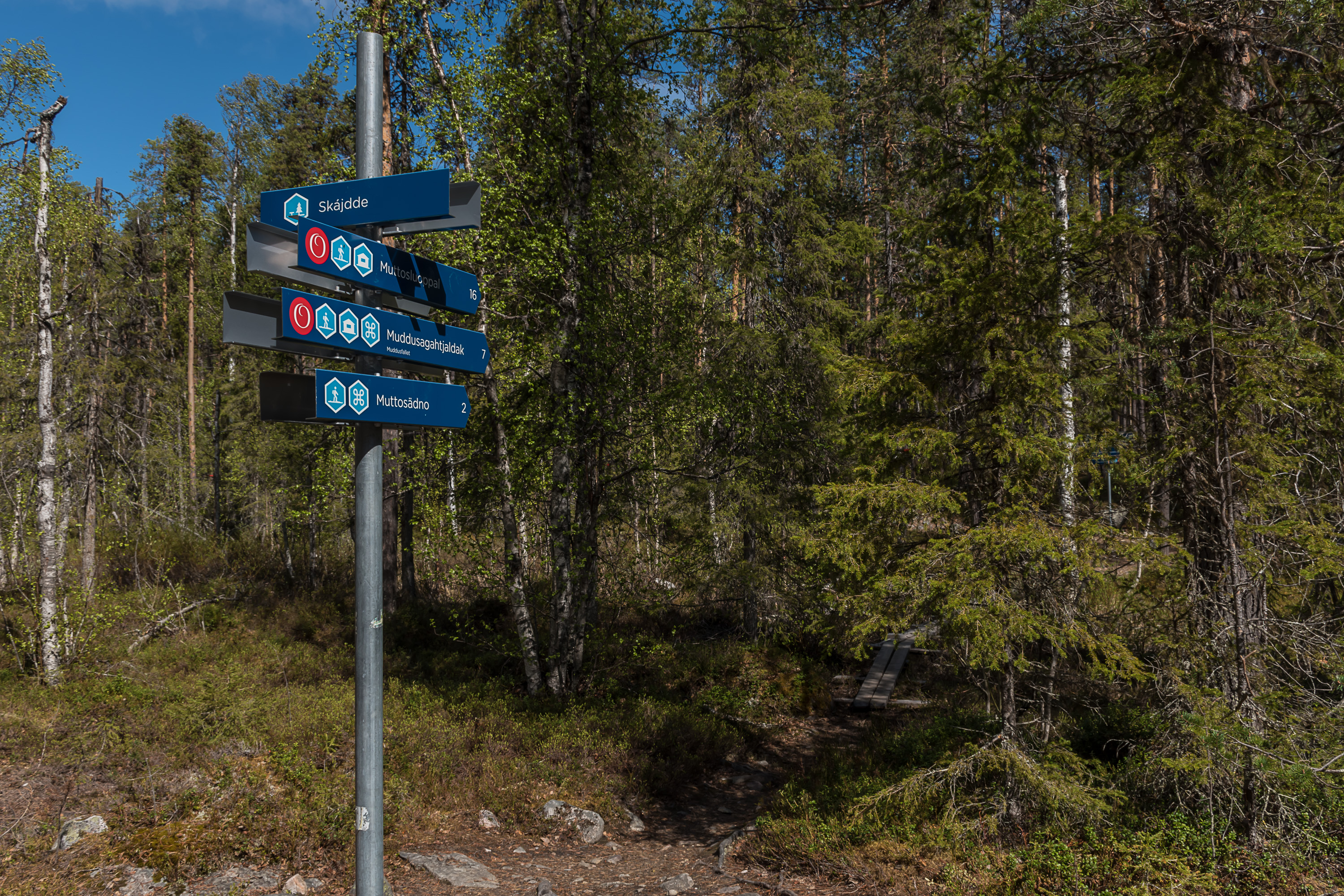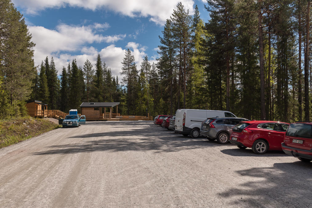 Самый короткий (7 км в одну сторону) маршрут к водопаду идет от главного входа в национальный парк (Скайдде, Skájdde), на юго-западе. Так что хотя Наттаваара, где я ночевал, и довольно недалеко от Муддуса, этот вход был с противоположной от Наттаваары стороны, и пришлось сначала сделать внушительный крюк через Мессауре. До Скайдде ехать 10 км по гравийной дороге от трассы E45, от ГЭС Лигга. Вход здорово напоминает типичный финский национальный парк — парковочка посреди леса, навес, чтоб гриллить, туалет, да столб с указателями в начале троп. Ну и, как видите, место весьма популярное, не то что те, что были накануне! Ну, тут и погода в этот день была прямо хорошая, и сама тропа несложная и известная.