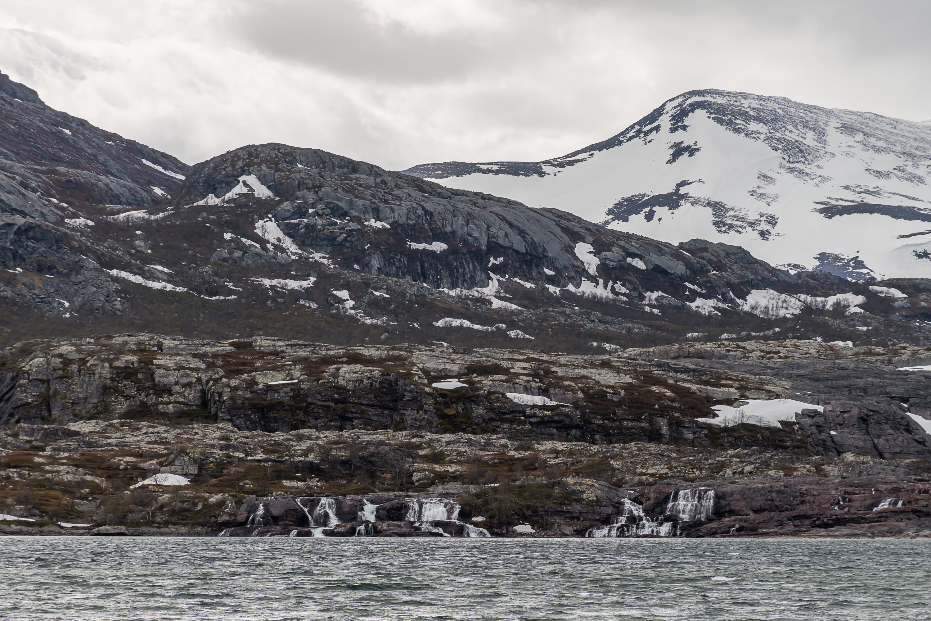 24. А с берега вдали на противоположном берегу видны водопады, не слишком-то впечатляющие на таком расстоянии. Именно там раньше и находился великий водопад Стура-Шёфаллет (Stora Sjöfallet, луле-саамск. Stuor Muorkkegårttje, Стуор-Муорккегортче),до строительства ГЭС Виетас.