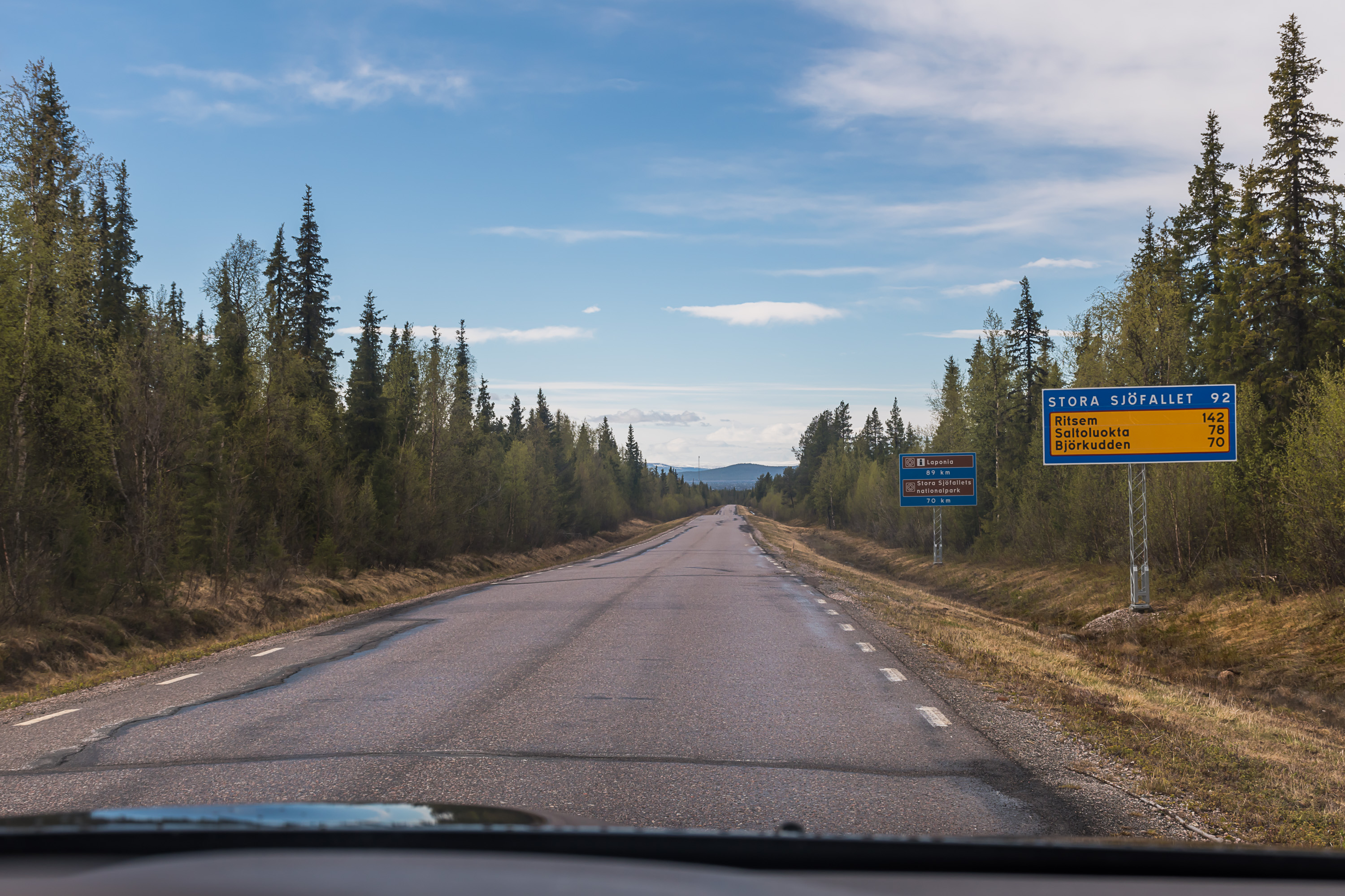 9. Вернувшись к машине, я поехал дальше в национальный парк Стура-Шёфаллет (Stora Sjöfallet; луле-саамск. Stuor Muorkke, Стуор-Муоркке). Дороги стремительно высохли. Дорога на Стура-Шёфаллет ответвляется от E45 чуть севернее поселка Порьюс. Это очень длинная и очень пустынная дорога, построенная изначально как служебная к ГЭС Виетас и Ритсем. Обе они расположены в верховьях Стура-Лулеэльвен, уже в самих Скандинавских горах.