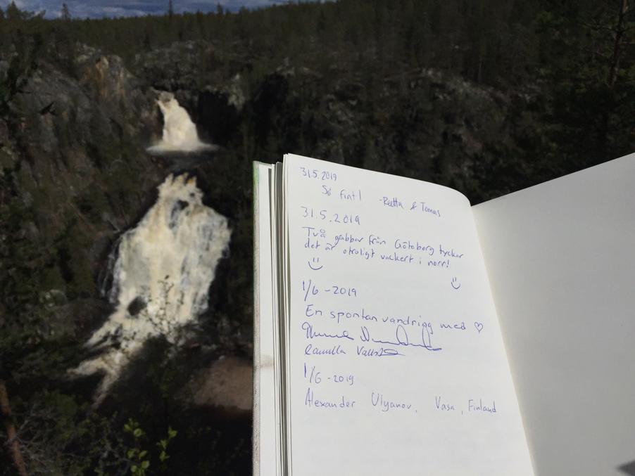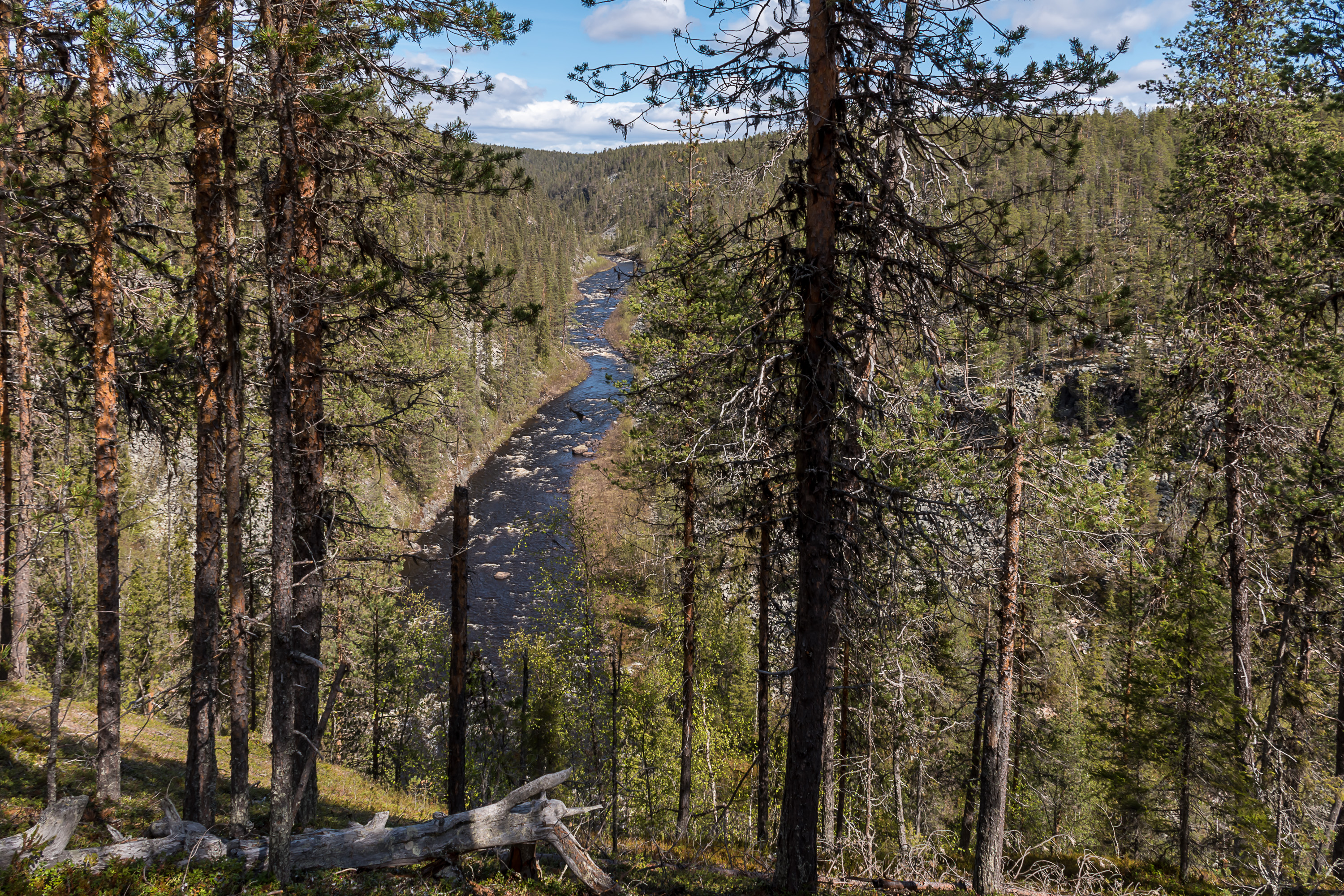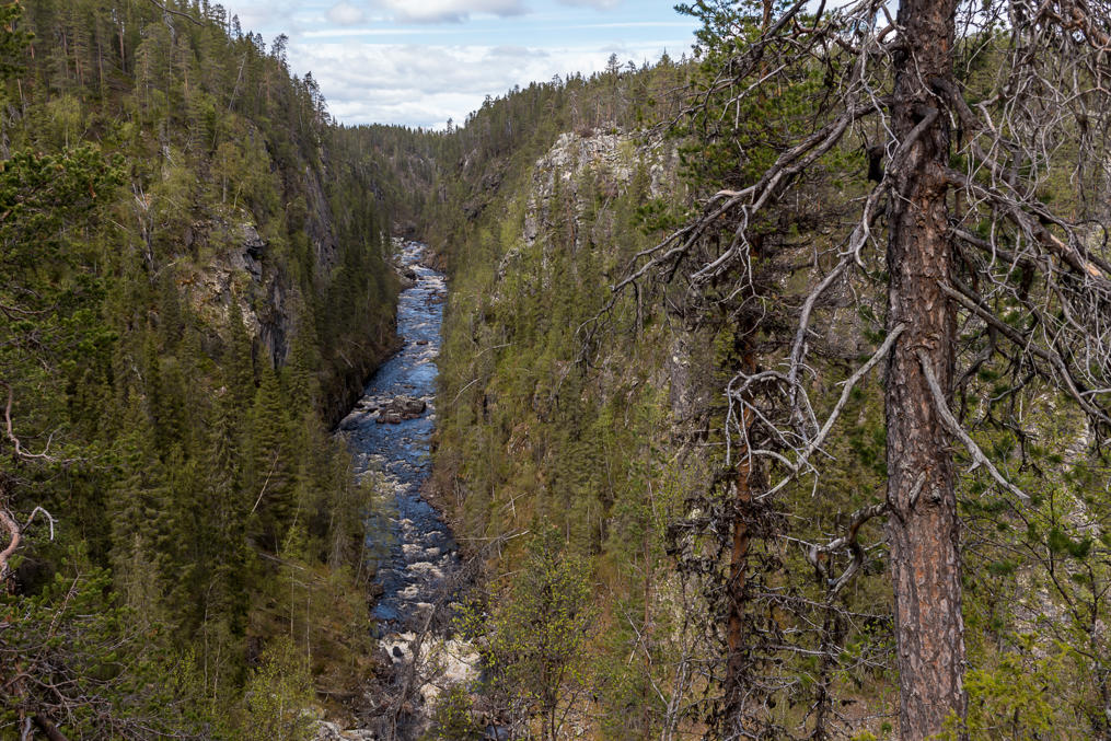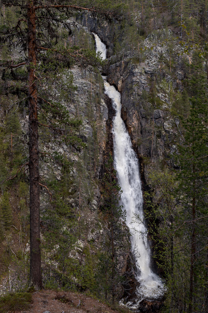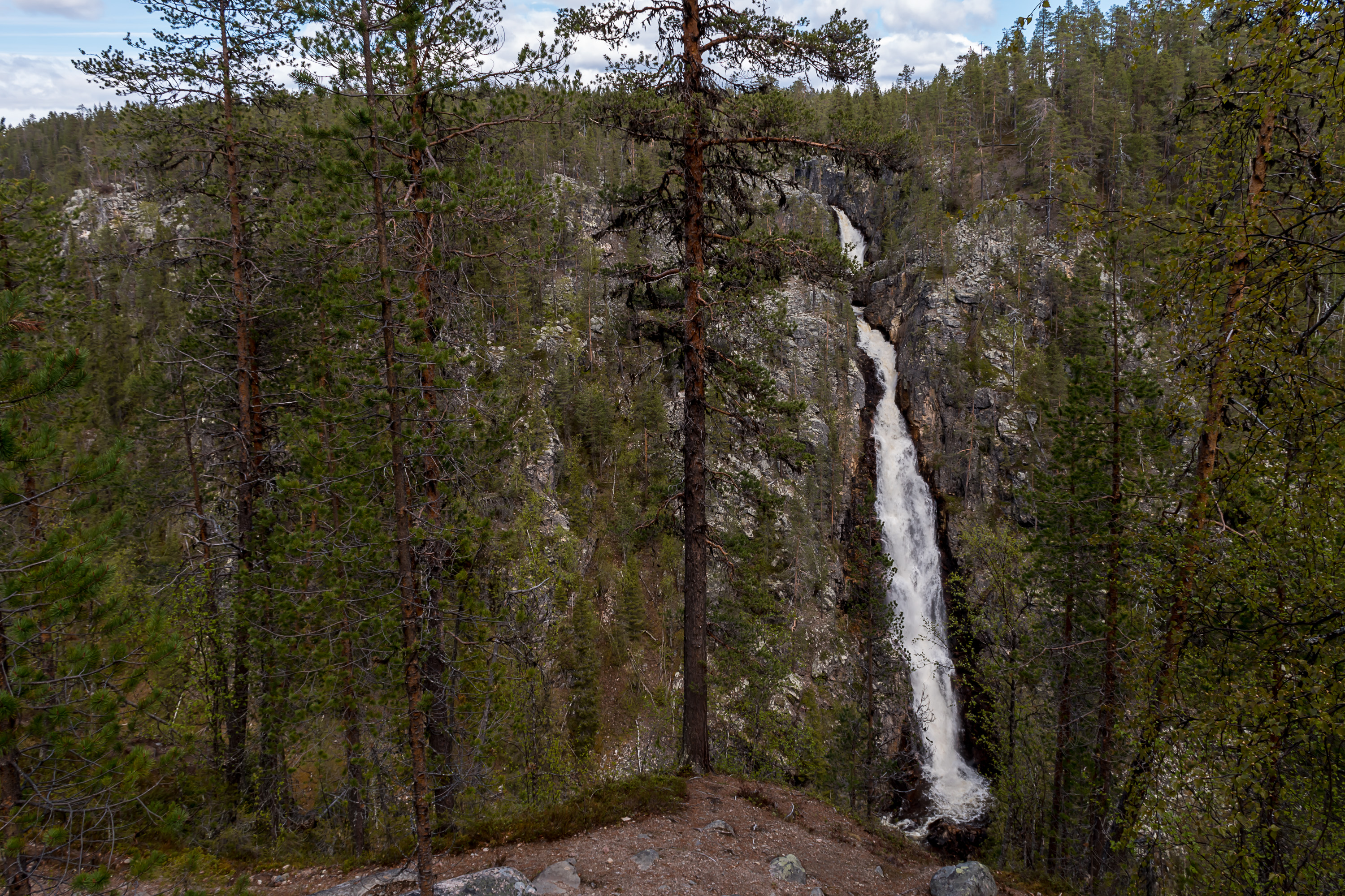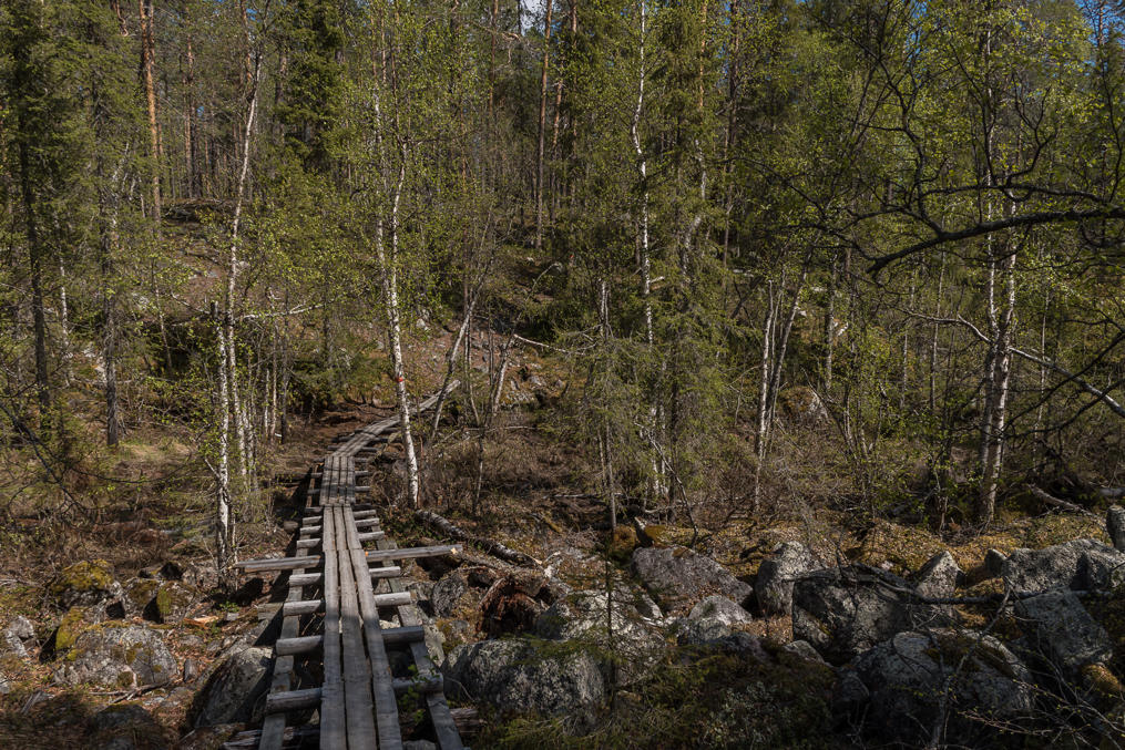 43. Тропа к водопаду идет по западной стороне каньона реки Муддусэльвен (Muddusälven, луле-саамск. Muttosädno, Муттосэдно), вверх по течению на север. В начале и еще потом в одном месте она временно разбивается на две тропы, одна чуть посложнее с более крутыми уклонами, по краю каньона, и другая более пологая, отклоняется слегка в лес. Я бы посоветовал более крутые варианты, хотя бы в одну сторону, а то иначе почти до самого конца реку толком и не видно будет.
