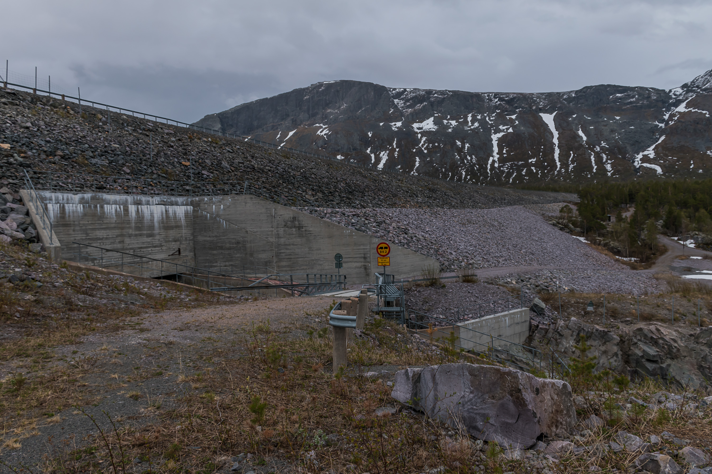 37. Ну а боковая дорога продолжается к плотине. Это одна из двух плотин Виетаса. Это довольно необычная ГЭС в целом; она отбирает воду сразу из двух разных рек, Стура-Лулеэльвен и ее притока Виедасэдно (Viedásädno). Плотина Стура-Лулеэльвен находится в местечке Суорвва, в нескольких километрах выше Виетаса по течению, а плотина Виедасэдно — собтсвенно, вот. А сама ГЭС находится и вовсе под землей между этими плотинами.