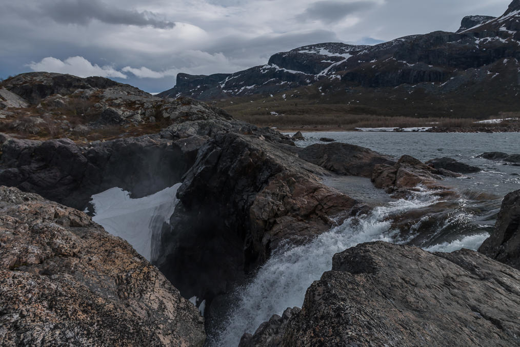 Вторая опция тоже была бы нетривиальной. Водопад не перепрыгнешь, а пересечь Стура-Лулеэльвен где-либо еще в национальном парке можно лишь в нескольких местах. В сезон для туристов через реку ходит пара катеров; один в Ритсеме, другой значительно ниже визит-центра, на основном маршруте тропы Кунгследен к Салтолуокте (Saltoluokta) — одной из всего нескольких шведских "горных станций" (fjällstation), целых хостелов в горах. Вероятно, также можно перейти реку по плотине Суорвва в нескольких километрах выше водопада, но тут я не уверен.