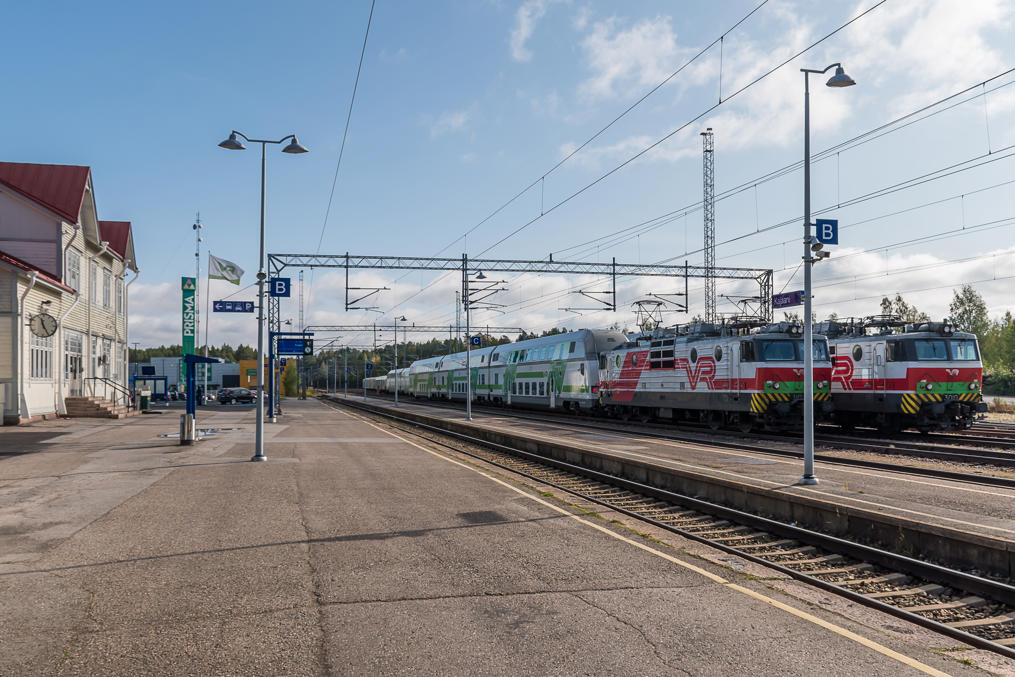 На фото (не самом качественном, к сожалению) — вагон на станции Каяани. Любопытно, что из-за этого вагона поезд, которому нужно менять направление на станции Коувола, вынужден перецеплять электровоз в другой конец. Обычно в финских поездах InterCity в хвостовом вагоне устанавливается вторая кабина, так что можно ехать и с локомотивом в хвосте состава. На фото эта кабина как раз видна справа.