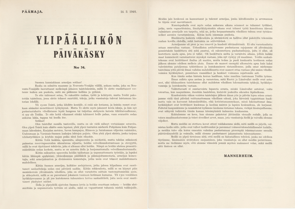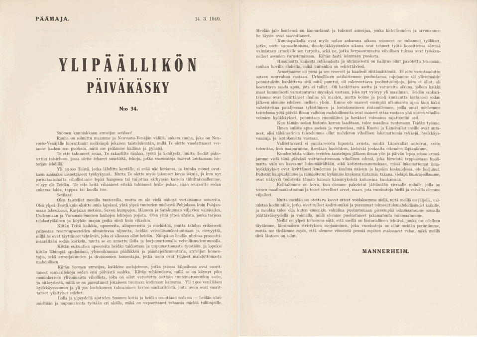 Строго говоря, это один из "ежедневных приказов" Маннергейма, которые представляли собой сводки от ставки главнокомандующего, которые доводились до сведения каждого человека в финской армии. Самый известный из этих приказов — приказ № 3 Войны-Продолжения, от 3.7.1941, "клятва меча", где Маннергейм обещал карелам освободить их от советского гнета и построить Великую Финляндию. Ну а второй по известности — вот этот, приказ № 34 Зимней войны, от 14.3.1940, о, собственно, окончании Зимней войны. Он также был зачитан по радио.