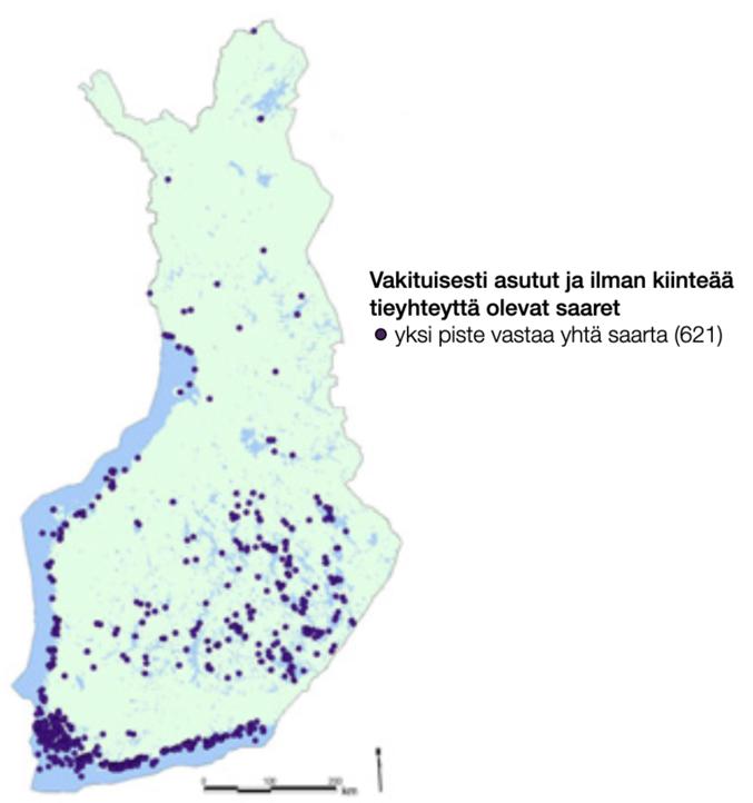 Любопытный документ можно найти на сайте финского Министерства сельского хозяйства и леса: отчет о всех островах Финляндии с постоянным населением, но без постоянной связи с большой землей, по состоянию на 2010 год. К сожалению, карта в документе (на которой каждый из этих островов отмечен точкой) приведена в низком разрешении. В отчет не включен регион Аландских островов, который, конечно, целиком является архипелагом сам по себе; это только острова в морях и озерах основной части Финляндии.