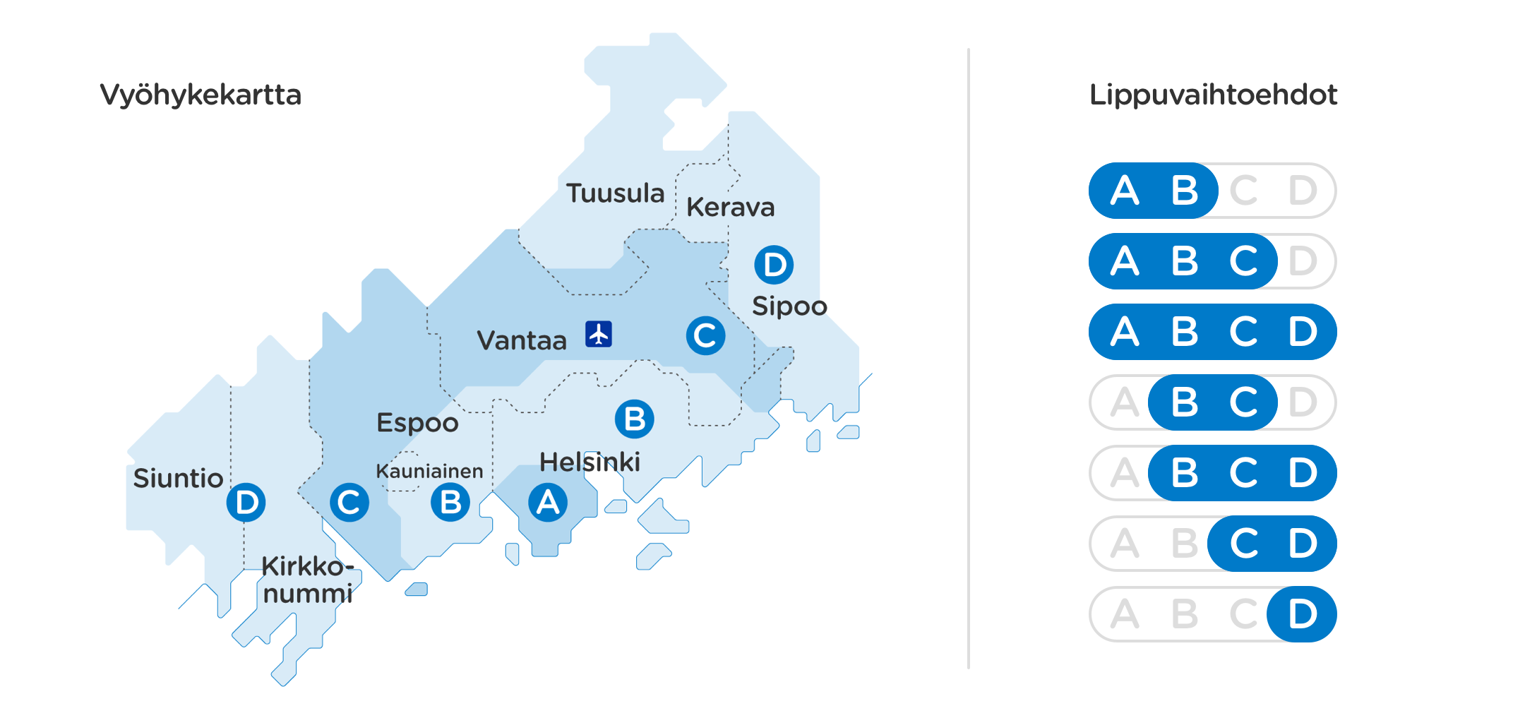 Стоимость билетов зависит от зоны, которых насчитывается четыре. Новая система тарифных зон введена совсем недавно, весной 2019 года. Старая система была основана на границах муниципалитетов, что сейчас уже не имеет большого смысла (восток Эспоо находится гораздо ближе к центру Хельсинки, чем восток Хельсинки, но билеты туда стоили дороже). Новая система основана в основном просто на расстояниях от центра: зона A — центр, B и C — остальная часть агломерации, D — дальние пригороды Большого Хельсинки.