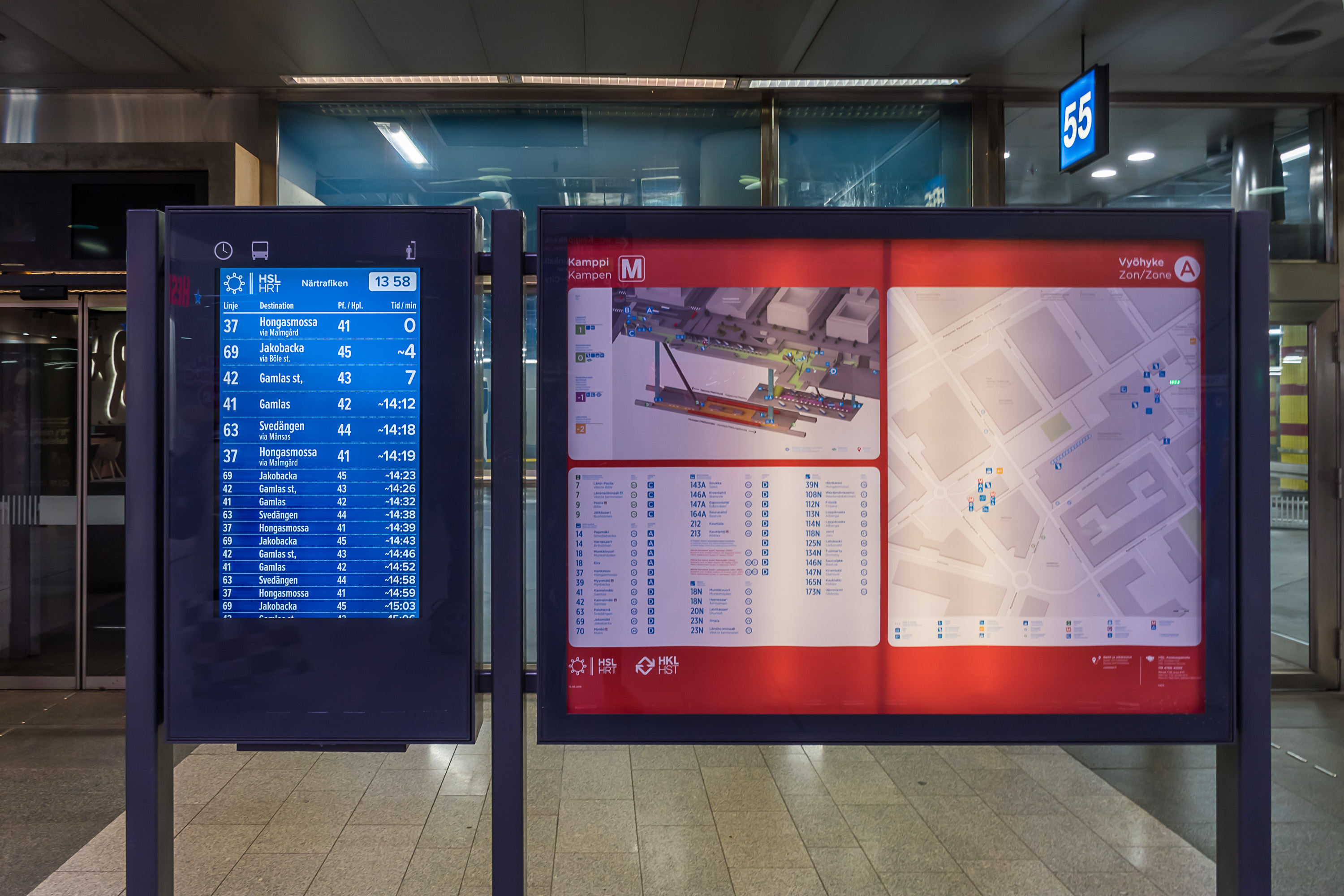 Информация о транспорте в реальном времени также доступна в приложении и планировщике Reittiopas, а также на станциях метро и электричек, и некоторых автобусных и трамвайных остановках. На остановках (особенно на автостанциях, но не только) это может быть и большое табло со всеми ближайшими отправлениям, но чаще это просто маленький экранчик, показывающих в цикле несколько следующих трамваев/автобусов. Время прибытия выводится со знаком "~", если это ожидаемое время по расписанию, и без него, если это точная информация в реальном времени. Мелкие остановки за пределами центра Хельсинки обычно не имеют дисплеев.