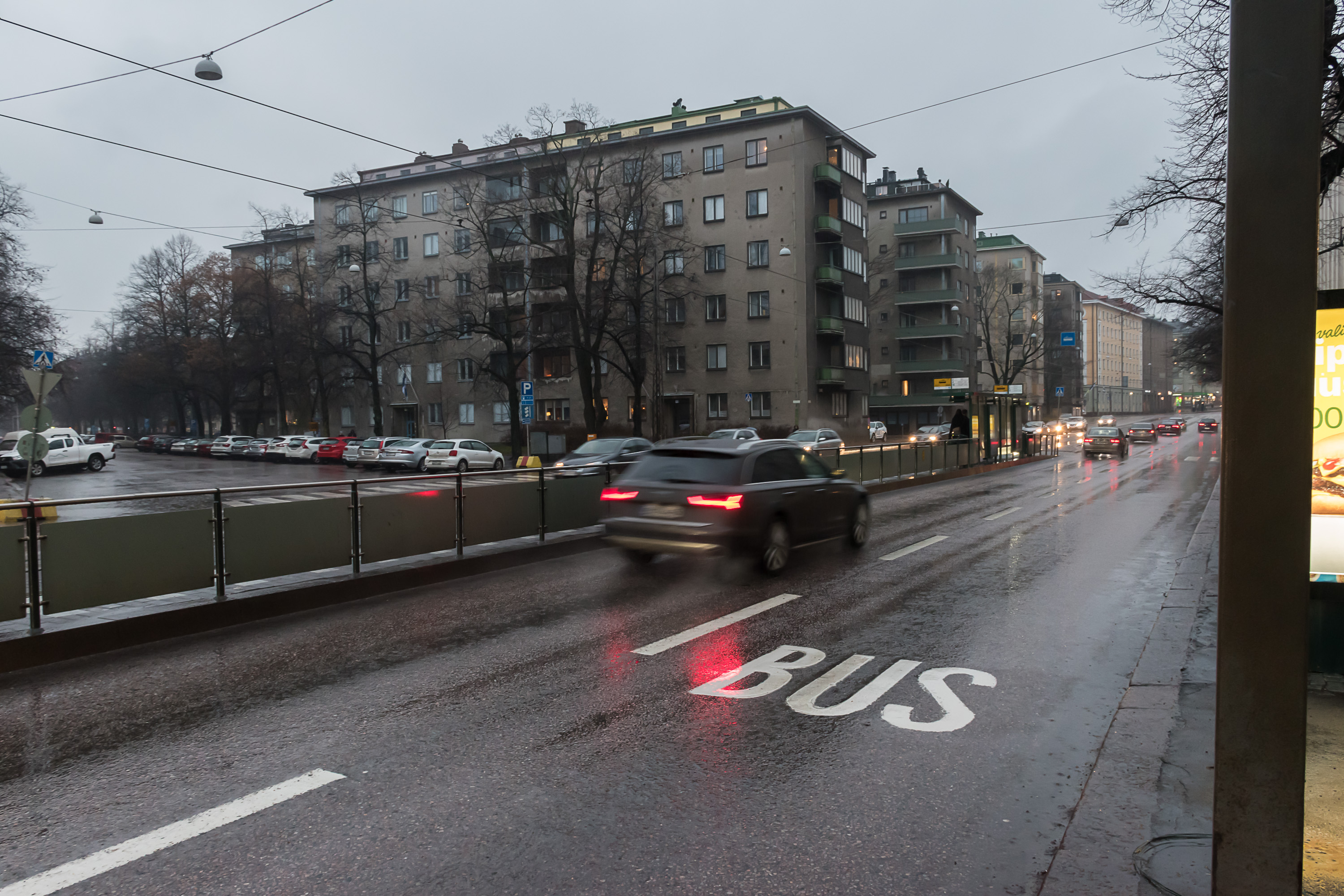 - Ограниченное количество полос для автомобилей, из-за упомянутых выделенных полос и трамвайных путей (например, на Маннерхейминтие, проспекте, представляющем собой главный въезд в центр с северо-запада, во многих местах для машин оставлено лишь по одной полосе в каждую сторону)