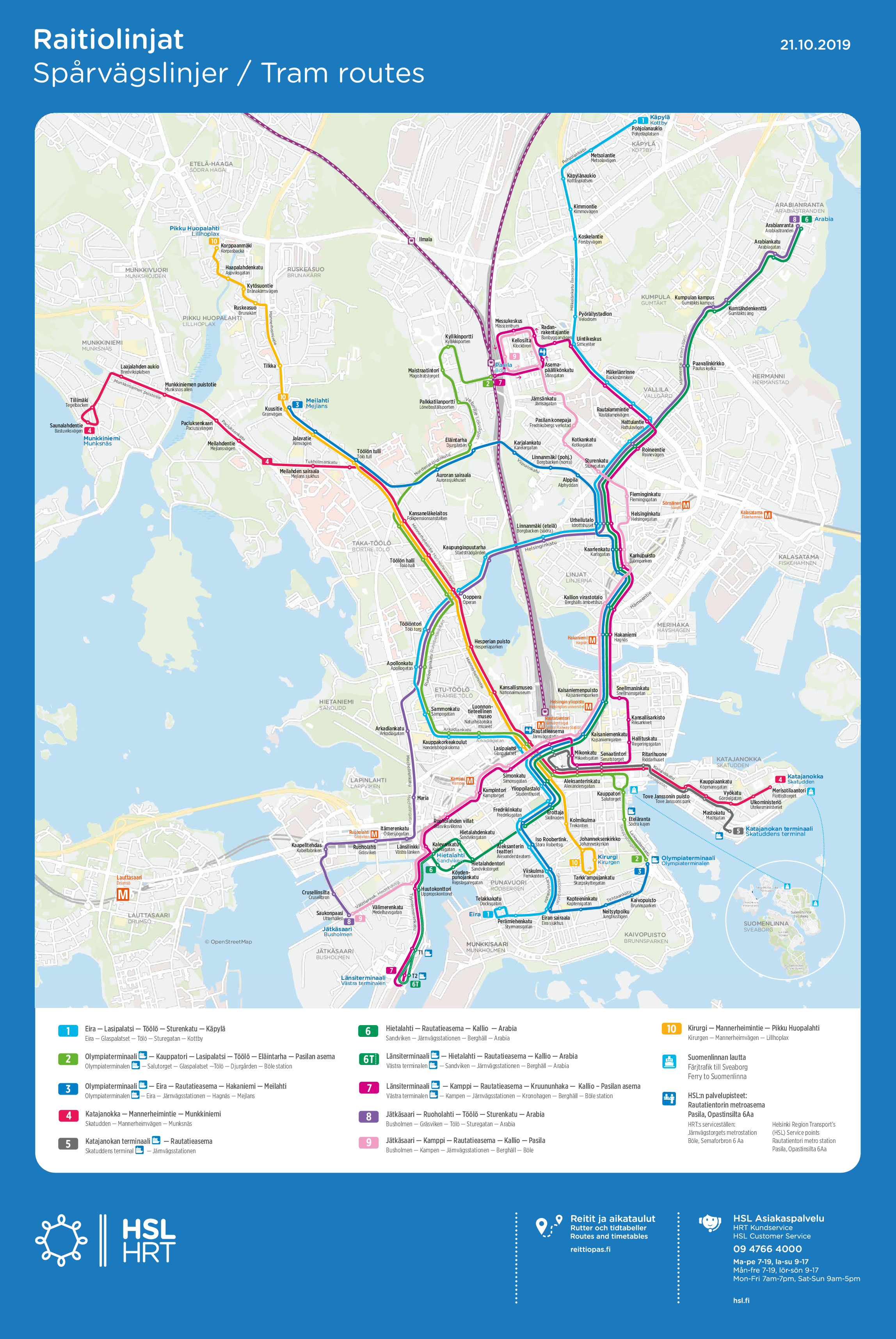 Трамваи также служат связью со всеми международными пассажирскими паромными терминалами в центре Хельсинки (терминалы Катайянокка и Олимпия в Южной гавани (Eteläsatama), и Западные терминалы в Западной гавани (Länsisatama)). Хотя все грузовые перевозки из цента города были выведены в порт Вуосаари на восточной окраине, знаменитые паромы на Таллин и Стокгольм (а также Мариехамн) продолжают отправляться из центра города. Это удобно для пересадки с другого местного и междугородного транспорта, хотя трамваи забиваются битком, когда прибывает паром (так же как и на улицах возникают пробки из-за выгрузившихся машин).
