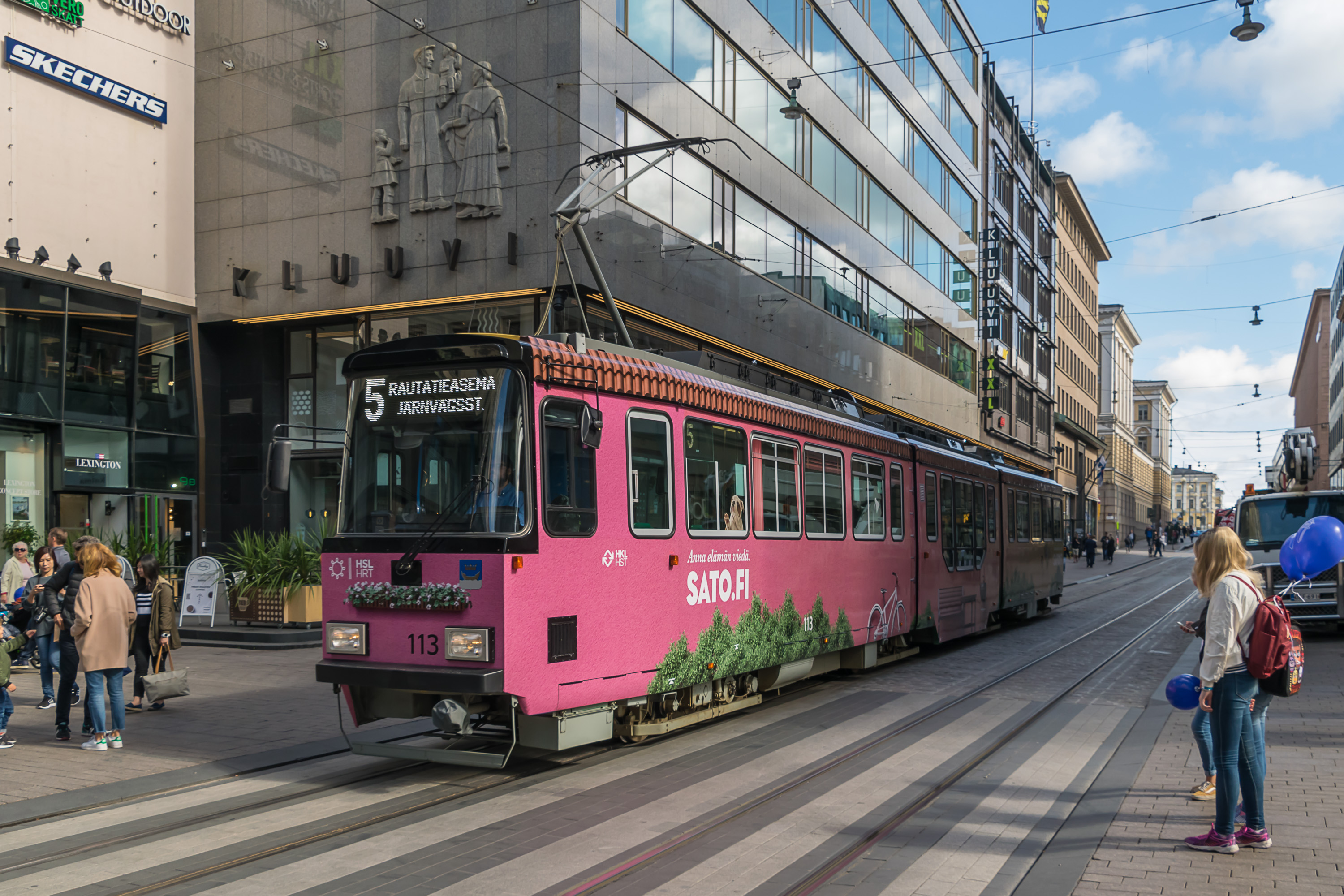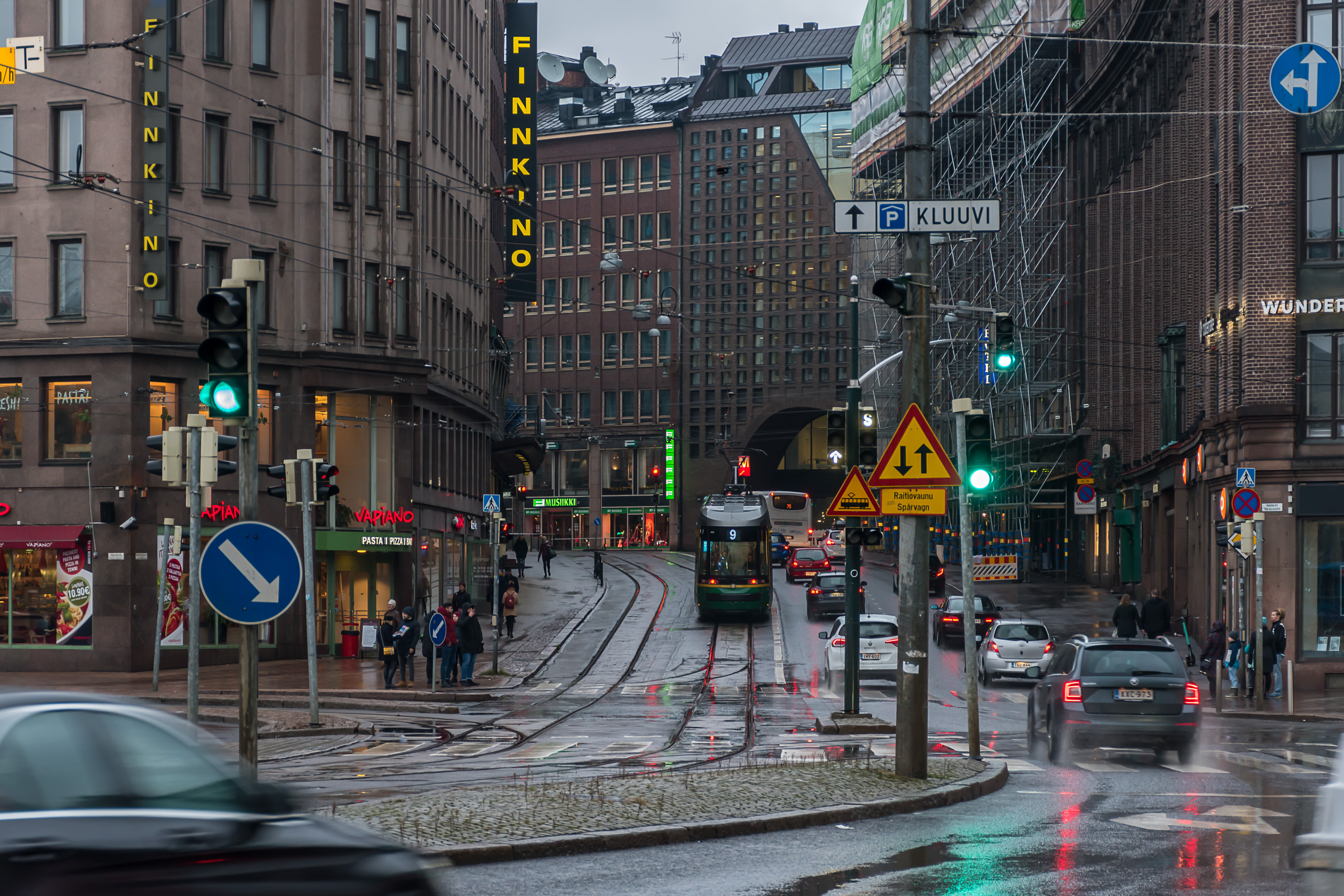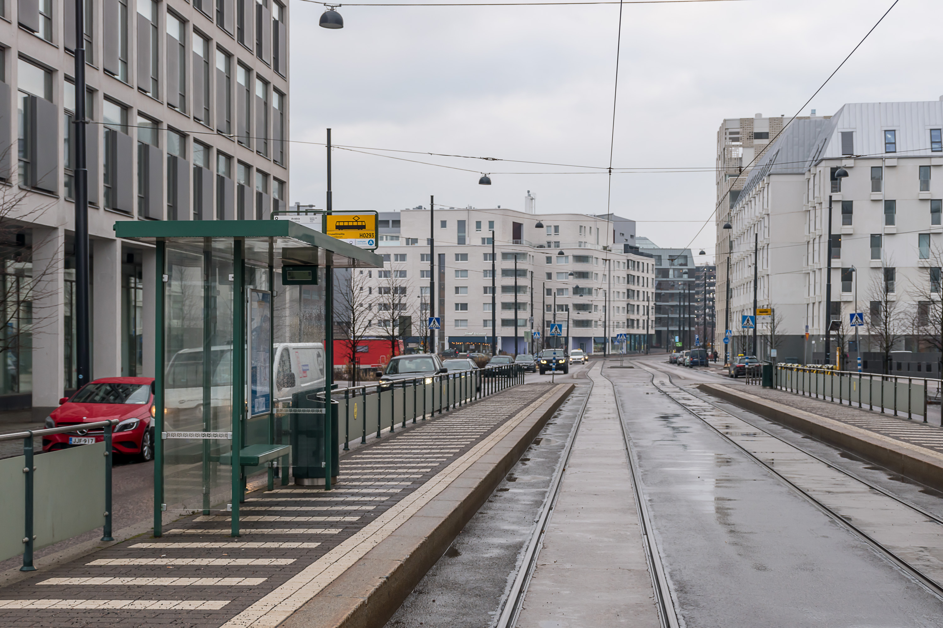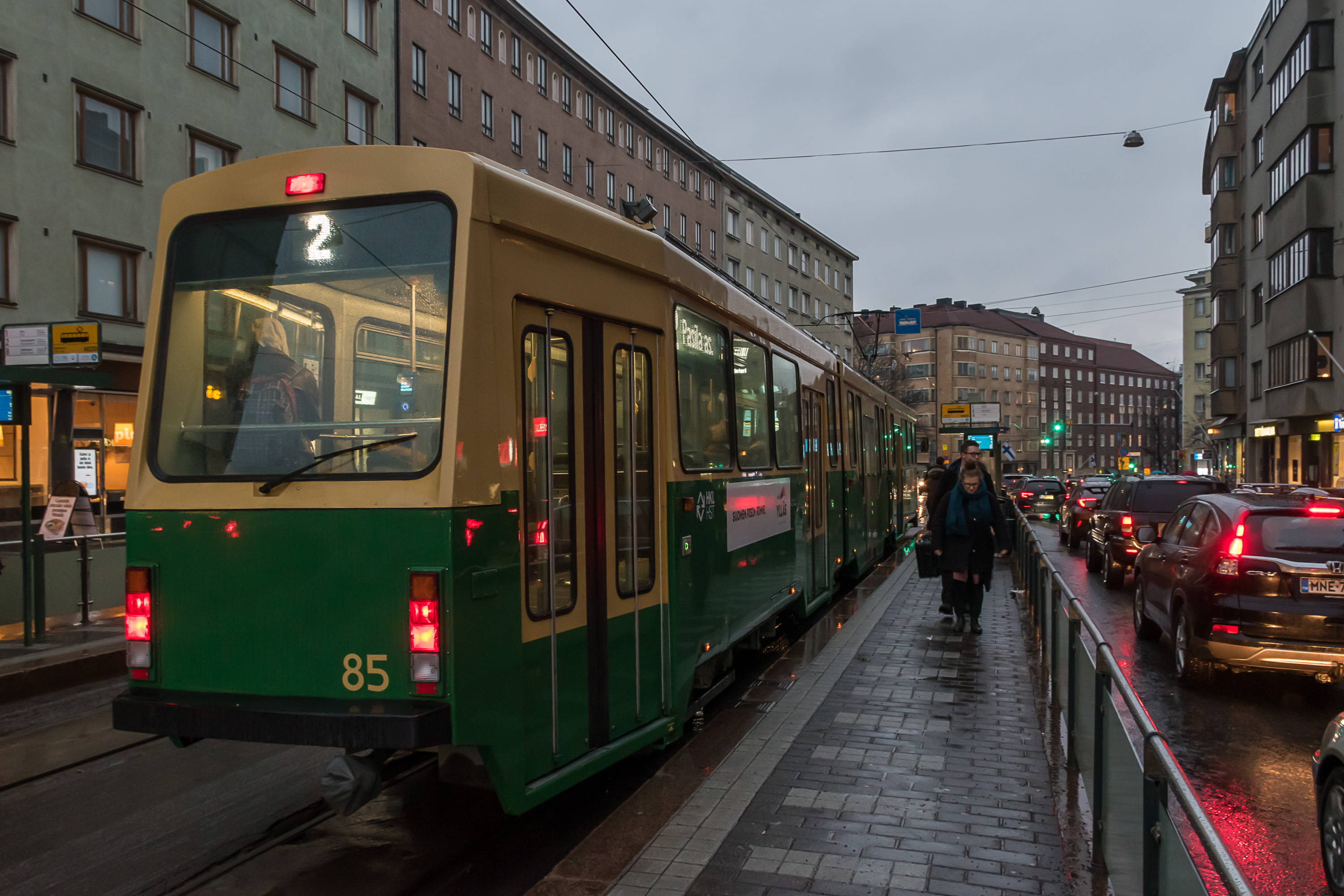 В центре Хельсинки существует довольно плотная трамвайная сеть, продолженная как на крупных улицах, так и в узких переулках. На улице Алексантеринкату (Aleksanterinkatu), главной пешеходной улице Хельсинки, движение разрешено только трамваям и такси. Трамвайные пути по возможности обособлены, и на перекрестках у них обычно бывает приоритет, как и предписано ПДД в большинстве стран; иногда также устанавливаются специальные треугольные светофоры, останавливающие все остальное движение, пока проезжает трамвай. Тем не менее, система неидеальна и трамвай местами может встать в пробку, хотя очень больших пробок в Хельсинки и не бывает.
